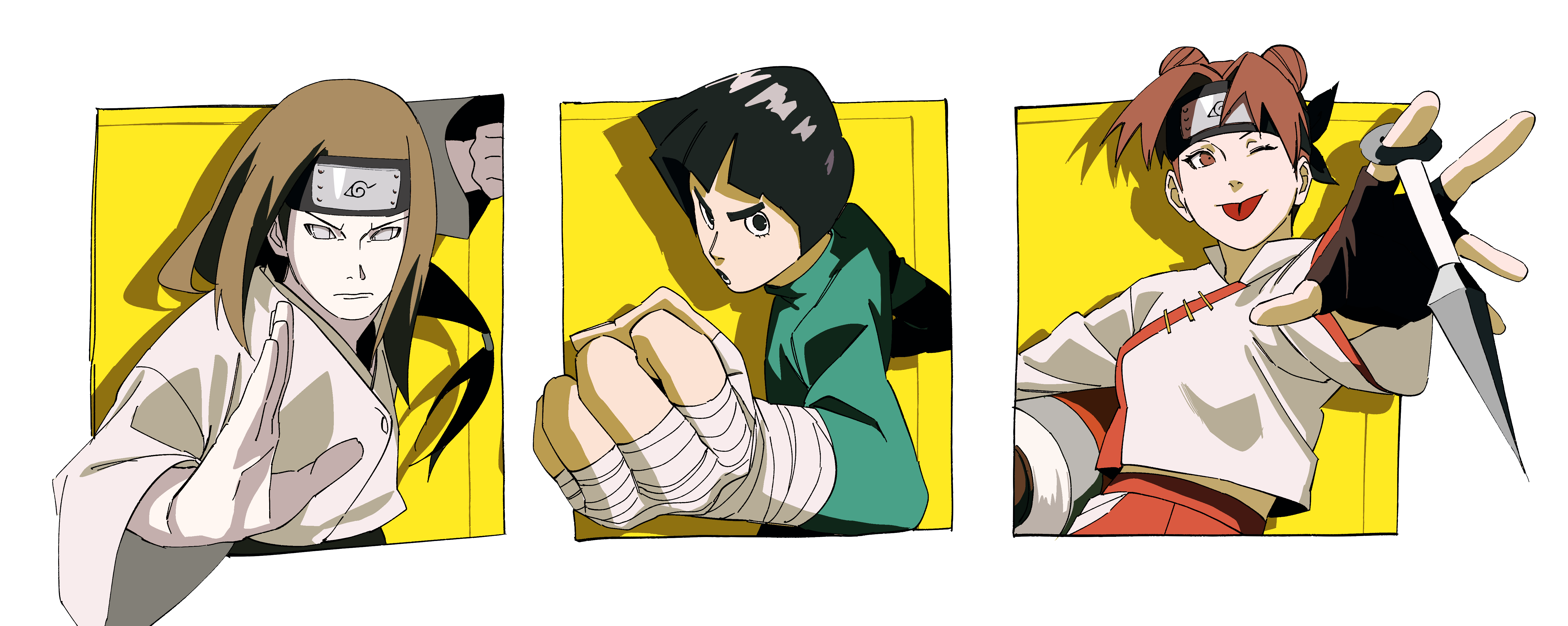 1girl 2boys ;p absurdres bandaged_arm bandages black_eyes black_gloves black_hair bodysuit bowl_cut brown_eyes brown_hair clenched_hand closed_mouth double_bun fingerless_gloves forehead_protector gloves green_bodysuit hair_bun highres holding holding_kunai holding_scroll holding_weapon hyuuga_neji konohagakure_symbol kunai long_hair long_sleeves looking_at_viewer looking_to_the_side low-tied_long_hair midriff_peek multiple_boys naruto_(series) naruto_shippuuden one_eye_closed open_mouth pnpk_1013 rock_lee scroll shirt short_hair tenten_(naruto) thick_eyebrows tongue tongue_out v-shaped_eyebrows weapon white_eyes white_shirt wide_sleeves