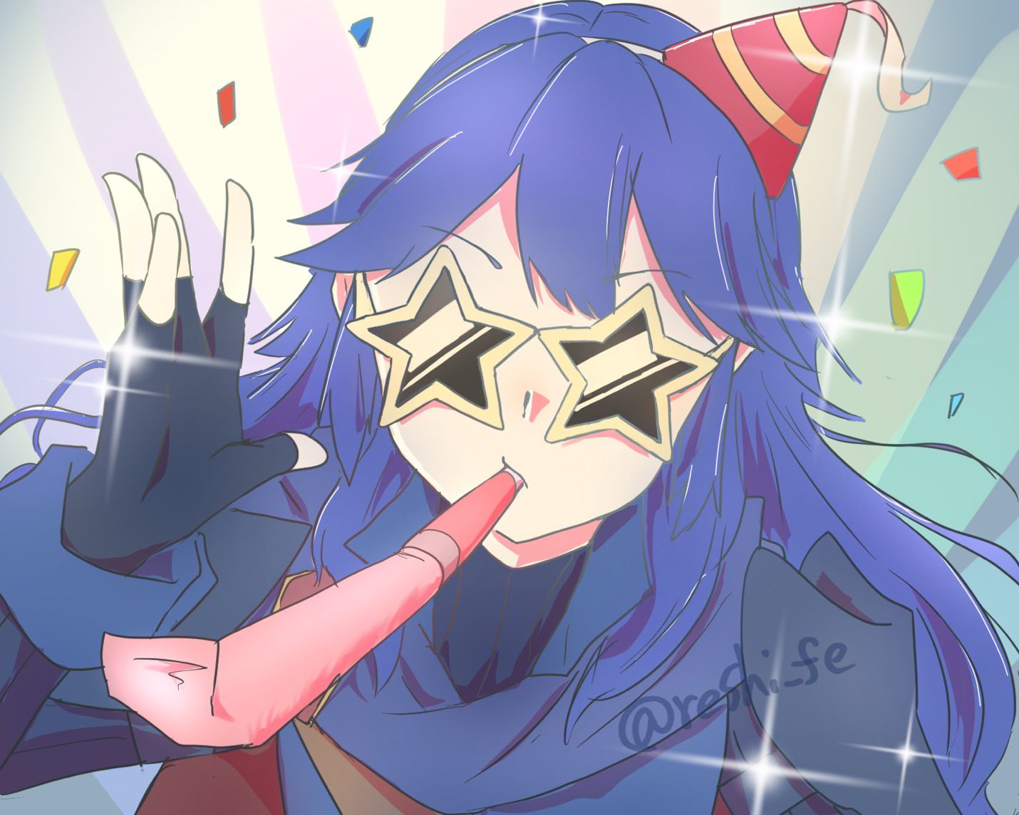 1girl blue_cape blue_gloves blue_hair cape commentary_request confetti fingerless_gloves fire_emblem fire_emblem_awakening gloves hat long_hair long_sleeves looking_at_viewer lucina_(fire_emblem) nintendo party_hat party_horn red_hat reshi_fe solo star-shaped_eyewear star_(symbol) sunglasses twitter_username