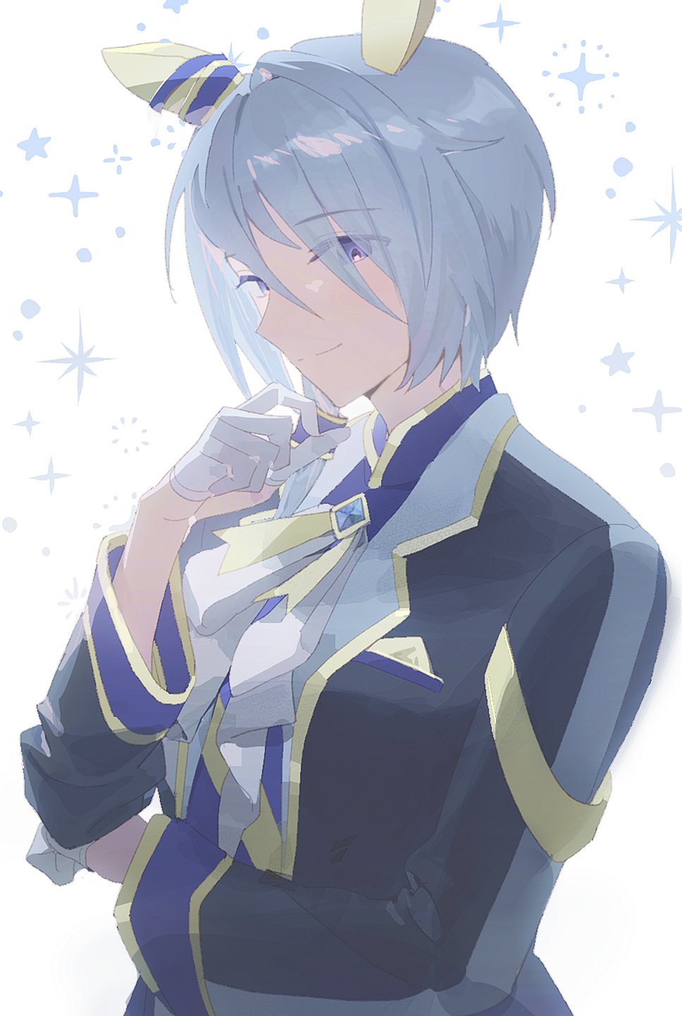 1girl 9nyo animal_ears black_jacket blue_hair closed_mouth commentary ear_covers gloves half_gloves highres horse_ears horse_girl jacket k.s.miracle_(umamusume) long_sleeves looking_at_viewer purple_eyes short_hair simple_background solo sparkle umamusume upper_body white_background white_gloves