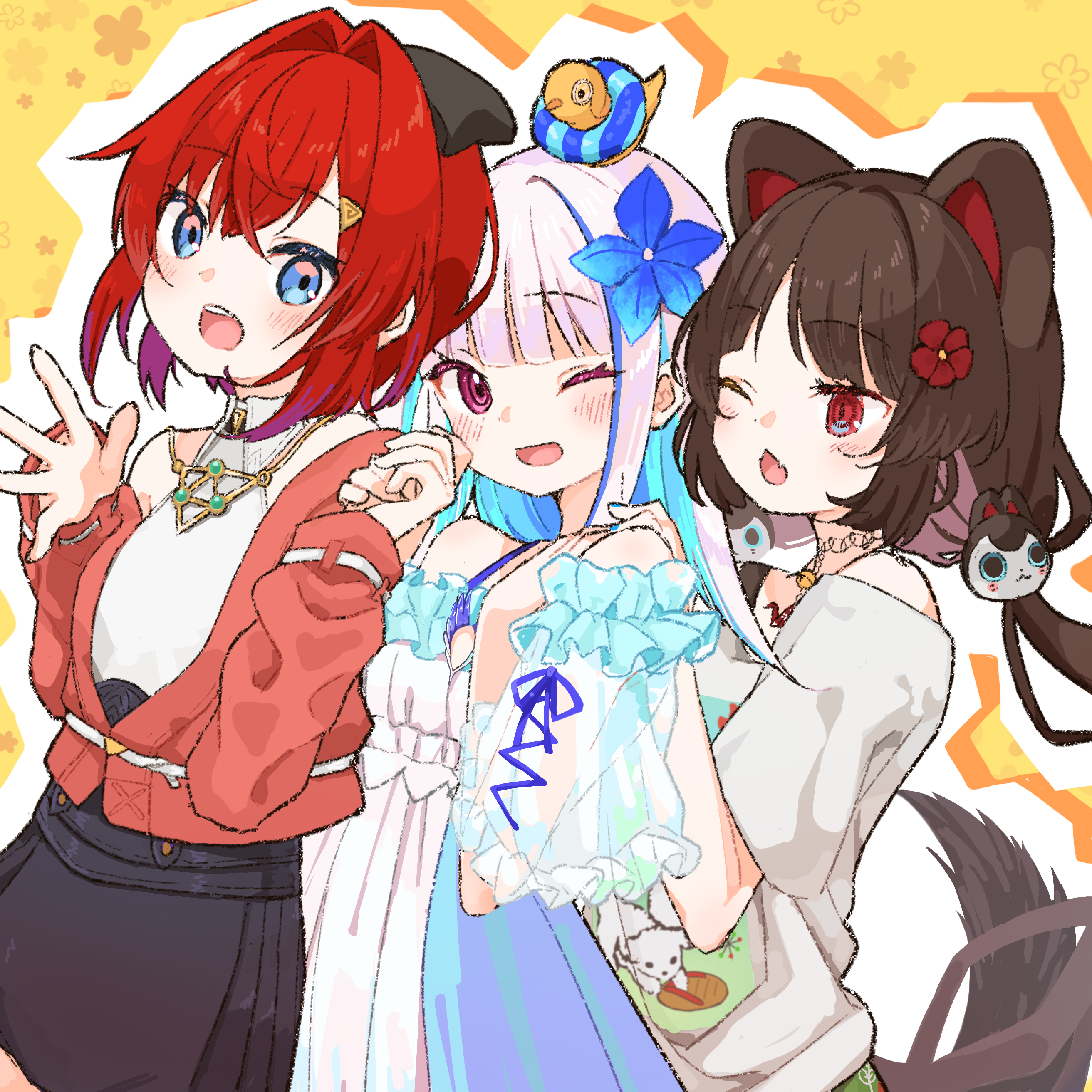 3girls :o absurdres ange_katrina ange_katrina_(summer_casual) animal animal_ears animal_hair_ornament animal_on_head belt bird bird_on_head black_bow black_skirt blue_eyes blue_flower blue_hair blue_nails blunt_bangs blush bow breasts brown_hair brown_tail choker collared_shirt colored_inner_hair commentary_request cowboy_shot dated detached_sleeves dog_ears dog_girl dog_tail dress fang floral_background flower frilled_dress frilled_sleeves frills from_side gold_necklace group_picture hair_bow hair_flower hair_intakes hair_ornament hand_on_another's_shoulder hand_on_own_shoulder hands_up high-waist_skirt highres holding_hands innertube inui_toko inui_toko_(summer_casual) jacket jewelry lace lace_choker lize_helesta lize_helesta_(2nd_costume) long_hair long_sleeves looking_at_another looking_at_viewer low_twintails monocle multicolored_hair multiple_girls nail_polish necklace nijisanji off-shoulder_shirt off_shoulder on_head one_eye_closed open_mouth outline pendant_choker print_shirt purple_eyes red_eyes red_flower red_hair red_jacket sanbaka_(nijisanji) sebastian_piyodore shirt short_hair sidelocks skin_fang skirt sleeveless sleeveless_dress sleeveless_shirt small_breasts smile streaked_hair swim_ring tail teeth textless_version triangle_hair_ornament twintails upper_teeth_only virtual_youtuber white_belt white_dress white_hair white_outline white_shirt white_sleeves yellow_background yellow_bird yuzuki_(yuduame)