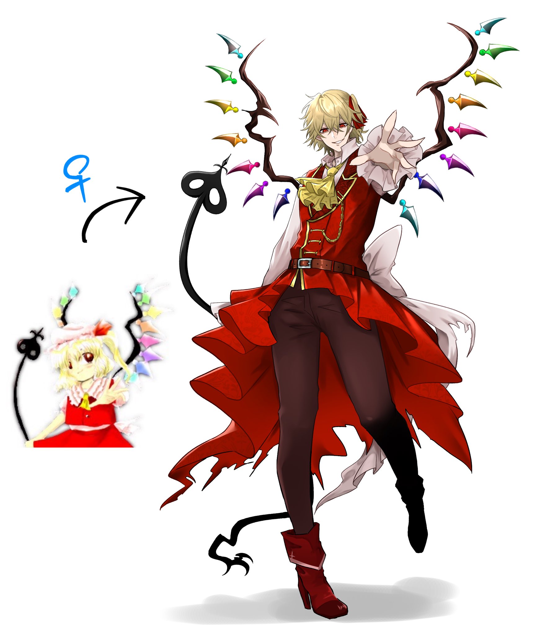 1boy arrow_(symbol) ascot asymmetrical_footwear back_bow belt black_boots blonde_hair boots bow brown_belt brown_pants chain coat collared_shirt commentary_request crystal_wings flandre_scarlet full_body genderswap genderswap_(ftm) gold_chain hair_between_eyes hair_ribbon hand_up high_heel_boots high_heels highres holding holding_polearm holding_weapon laevatein_(touhou) lapels long_sleeves looking_at_viewer male_focus mismatched_footwear multicolored_wings nap_muntarou one_side_up pants polearm puffy_long_sleeves puffy_sleeves red_boots red_coat red_eyes red_ribbon ribbon shadow shirt short_hair simple_background sleeveless sleeveless_coat smile solo spear standing standing_on_one_leg teeth torn_clothes touhou weapon white_background white_bow white_shirt wings yellow_ascot zun_(artist)