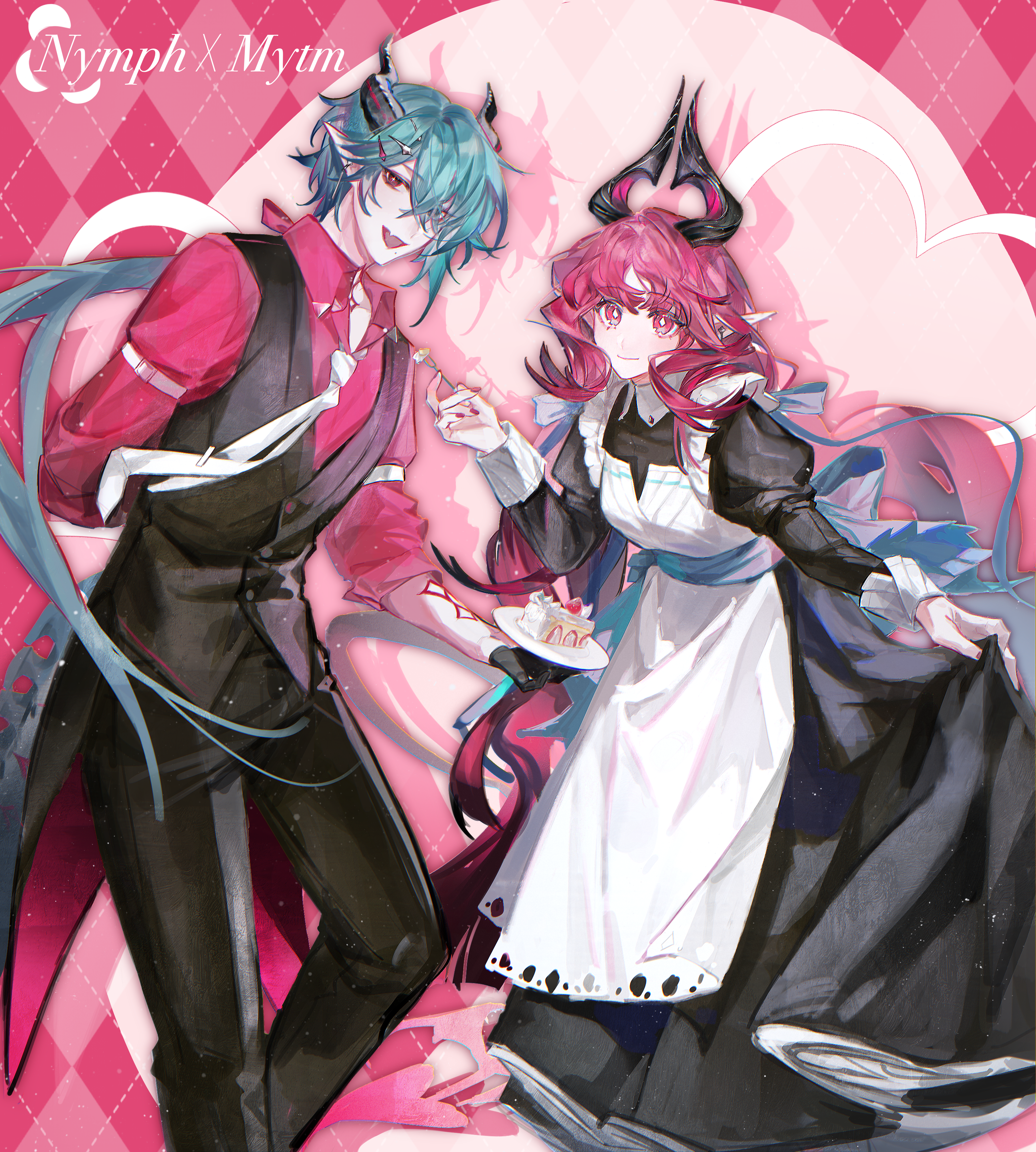 1boy 1girl :d absurdres apron aqua_hair argyle_background arknights arm_behind_back black_dress black_eyes black_horns black_pants black_vest bright_pupils buttons cake cake_slice character_name chinese_commentary closed_mouth collared_shirt commentary_request cream diamond-shaped_pupils diamond_(shape) dress fang feet_out_of_frame fingernails food fruit heart highres holding holding_own_dress holding_plate horns juliet_sleeves light_particles long_dress long_hair long_sleeves maid_apron mitm_(arknights) mole mole_under_mouth nail_polish necktie nymph_(arknights) open_mouth pants pink_background pink_eyes pink_hair pink_nails pink_shirt plate pointy_ears puffy_sleeves shirt skin_fang sleeve_garter sleeves_rolled_up smile standing strawberry symbol-shaped_pupils tie_clip tongxi65938_(mo_zuoren) vest waistcoat white_apron white_necktie white_pupils