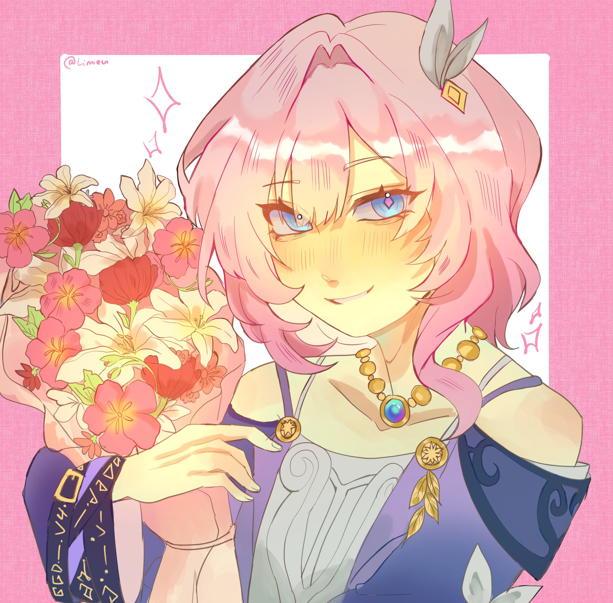 1girl blue_eyes border bouquet breasts coat commentary cyrene_(philia093)_(honkai:_star_rail) cyrene_(honkai:_star_rail) dress english_commentary flower hair_ornament highres holding holding_bouquet honkai:_star_rail honkai_(series) jewelry limieui looking_at_viewer medium_hair necklace pink_border pink_hair purple_coat small_breasts smile solo upper_body white_background white_dress