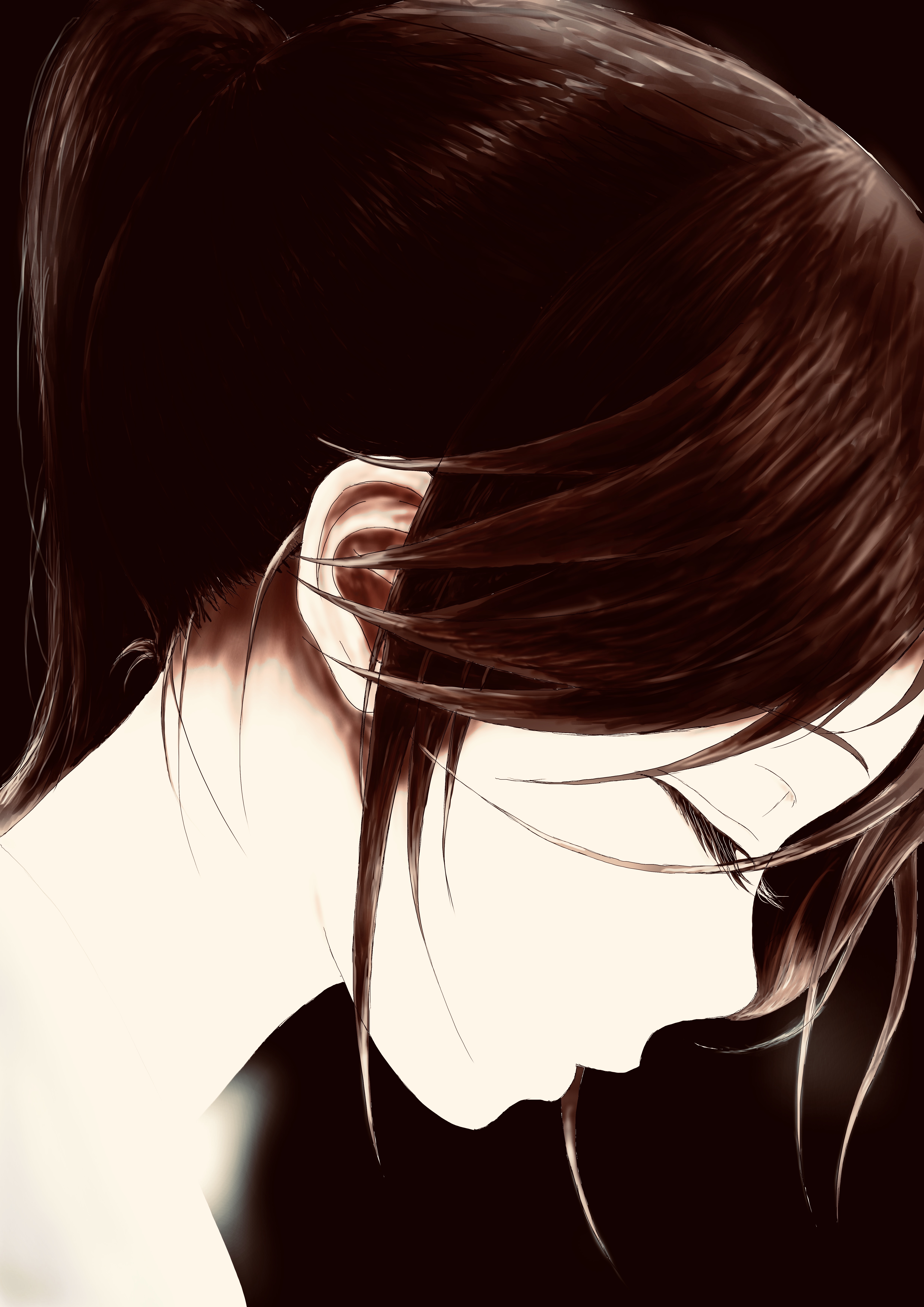 1girl absurdres bbmasa black_background black_hair closed_eyes closed_mouth commentary from_side hibike!_euphonium highres kasaki_nozomi liz_to_aoi_tori ponytail portrait profile short_hair simple_background solo