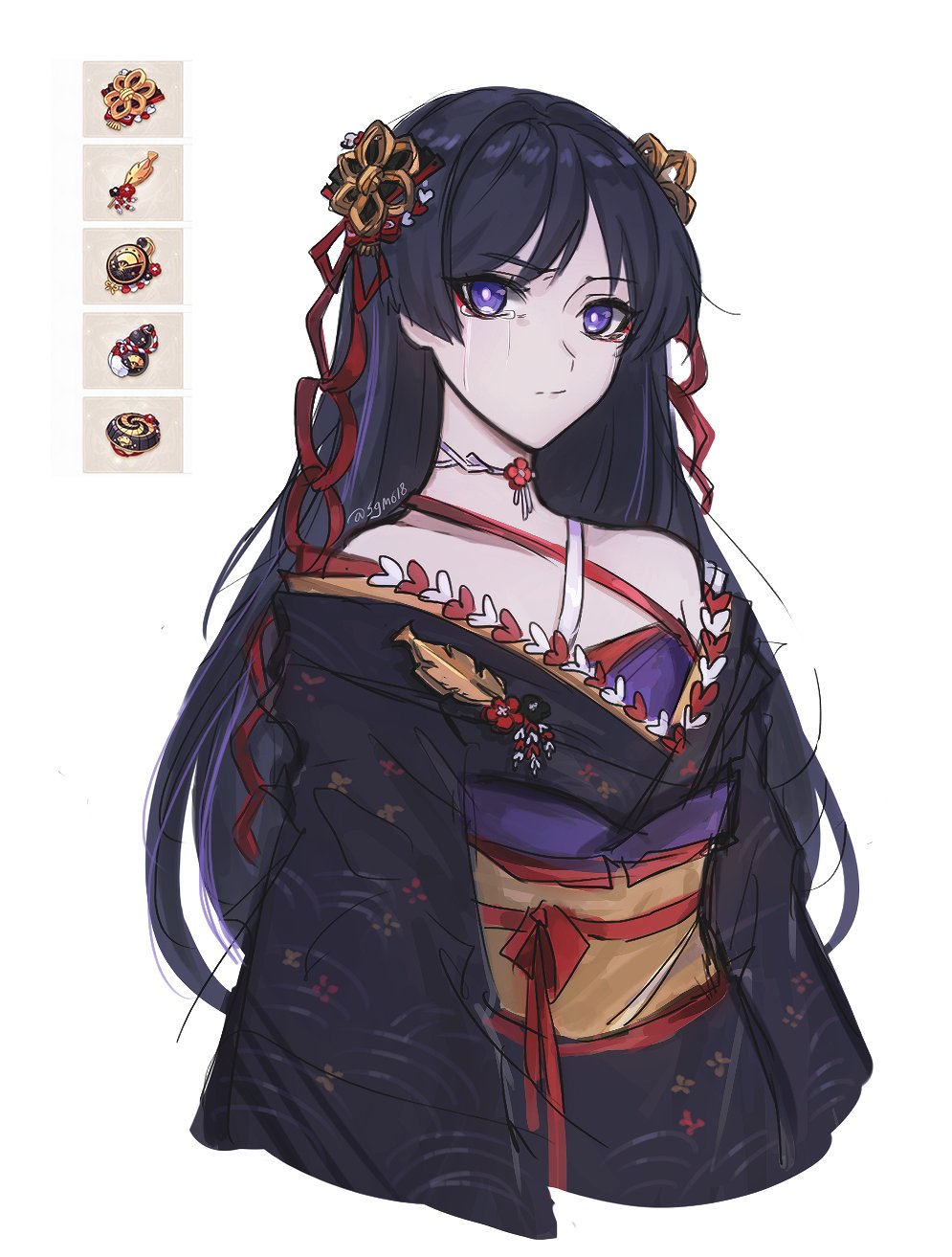 1boy alternate_costume alternate_hair_length alternate_hairstyle androgynous arms_at_sides black_hair black_kimono black_sleeves blunt_ends choker choppy_bangs closed_mouth criss-cross_halter cropped_legs crossdressing crossdressing_(mtf) eyeliner eyeshadow floral_print floral_print_kimono flower genshin_impact hair_ornament halterneck highres japanese_clothes juban kimono long_hair looking_at_viewer makeup male_focus multicolored_hair obi obiage obijime off_shoulder official_art_inset print_kimono purple_eyes purple_pupils red_eyeliner red_eyeshadow red_flower sash scaramouche_(genshin_impact) sgm618 solo split_mouth streaked_hair tears twitter_username undershirt white_choker wide_sleeves yellow_kimono