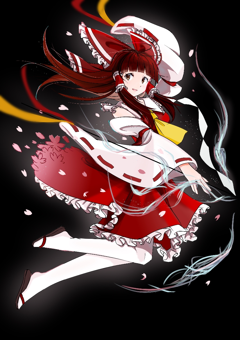 1girl ascot bow brown_eyes commentary detached_sleeves falling_petals frilled_bow frilled_hair_tubes frilled_skirt frills gohei hair_bow hair_tubes hakurei_reimu long_hair looking_at_viewer mcnyan open_mouth pantyhose petals red_bow red_hair red_skirt ribbon-trimmed_sleeves ribbon_trim sandals skirt skirt_set smile solo touhou white_pantyhose yellow_ascot