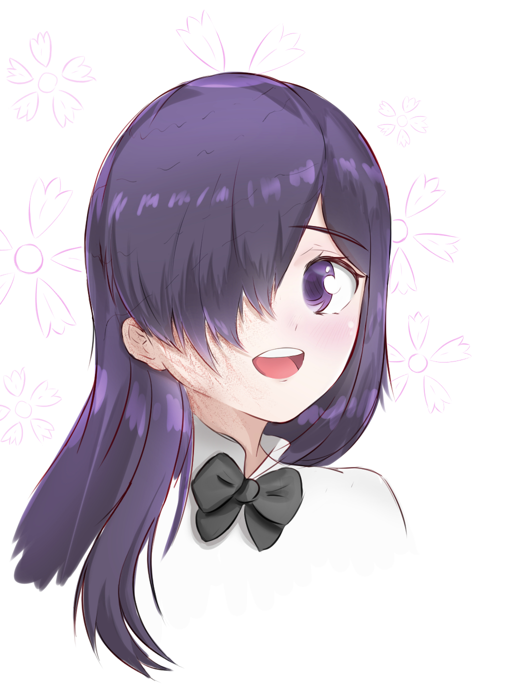 1girl black_bow bow burn_scar commentary eyelashes hair_over_one_eye hanawizu highres ikezawa_hanako katawa_shoujo long_hair open_mouth purple_hair scar scar_on_face scar_on_neck simple_background smile solo teeth upper_teeth_only white_background