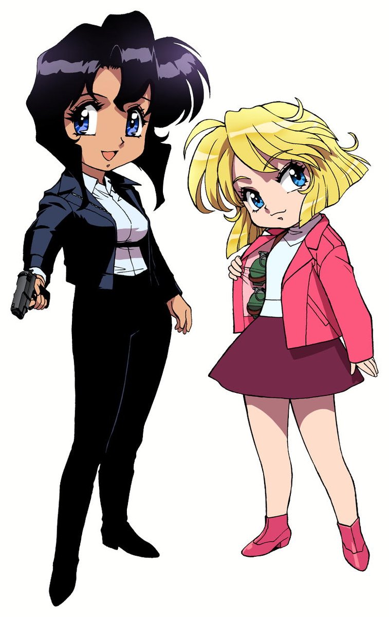 2girls black_hair breasts chibi closed_mouth dark-skinned_female dark_skin full_body gun gunsmith_cats handgun highres holding holding_gun holding_weapon looking_at_viewer minnie_may_hopkins multiple_girls official_art open_mouth rally_vincent short_hair simple_background skirt smile sonoda_ken'ichi weapon white_background