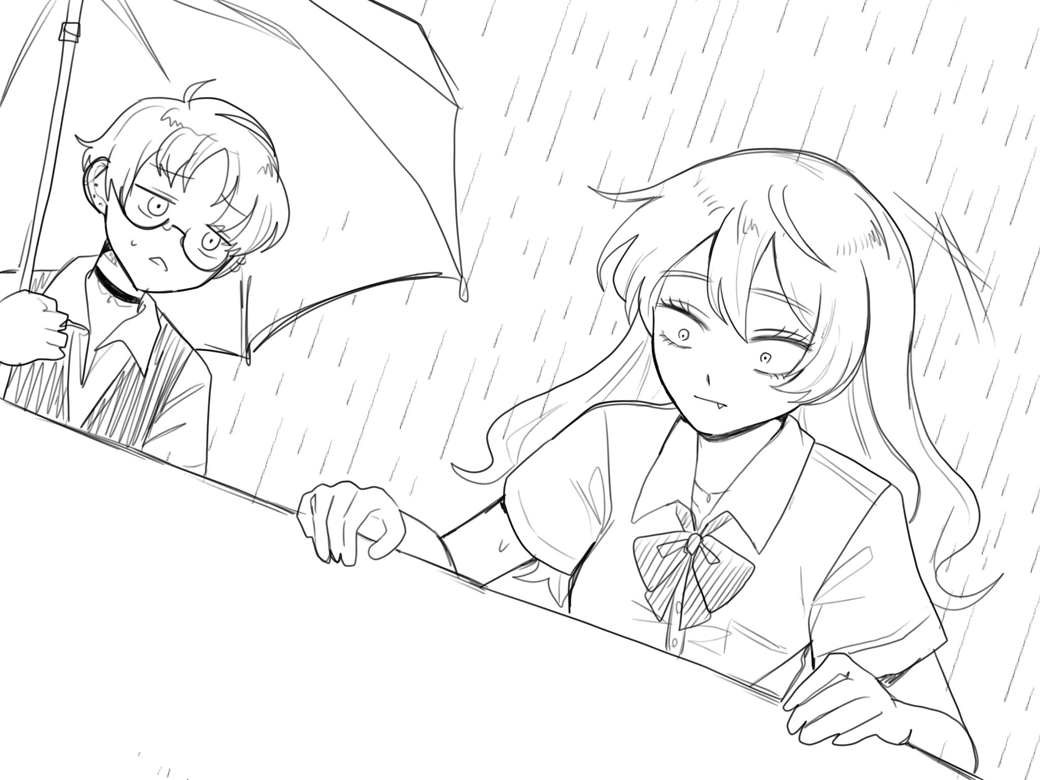2girls bien_(k2nshow) bow bowtie choker collared_shirt fang futsuu_no_keion-bu glasses greyscale highres holding holding_umbrella jealous lineart long_hair looking_at_another monochrome multiple_girls nikaidou_mawari parted_bangs parted_lips rain shirt short_hair short_sleeves sketch tatsumi_reiha umbrella wide-eyed