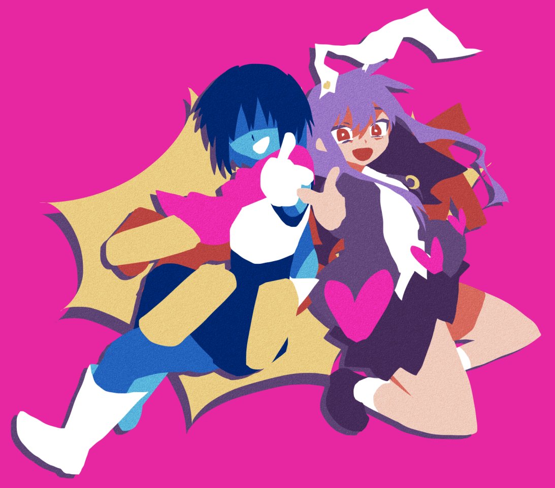 1girl 1other :d androgynous animal_ears black_hair black_shoes black_skirt blue_pants blue_skin boots colored_skin crescent crescent_pin crossover deltarune finger_gun full_body gloves hair_over_eyes jacket jumping kaiten_gunshuu_no_kage kris_(deltarune) long_hair long_sleeves looking_at_viewer no_lineart open_clothes open_jacket open_mouth pants pink_background pink_scarf pleated_skirt purple_hair purple_jacket rabbit_ears rabbit_girl red_eyes reisen_udongein_inaba scarf shirt shoes short_hair simple_background skirt smile socks touhou utdr_(toby_fox) white_boots white_gloves white_shirt white_socks