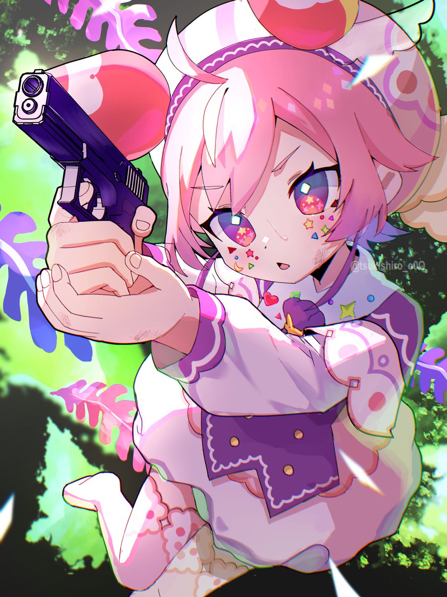 1girl ahoge animal_ears dress facial_mark gun hair_between_eyes hat highres holding holding_gun holding_weapon leaf leaf_background nijisanji pink_hair purple_eyes sea_slug_ears sea_slug_girl slug_girl solo star_(symbol) sweatdrop symbol-shaped_pupils thighhighs tsukishiro_o0o ushimi_ichigo virtual_youtuber weapon white_dress white_thighhighs