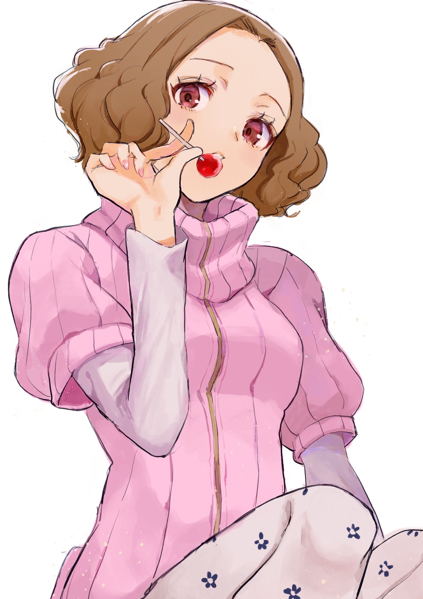 1girl breasts brown_eyes brown_hair candy floral_print food food_in_mouth highres holding holding_candy holding_food holding_lollipop kanna_nijiniji lollipop lollipop_in_mouth long_sleeves looking_at_viewer okumura_haru pantyhose persona persona_5 pink_sweater shirt short_hair simple_background solo sweater white_pantyhose white_shirt
