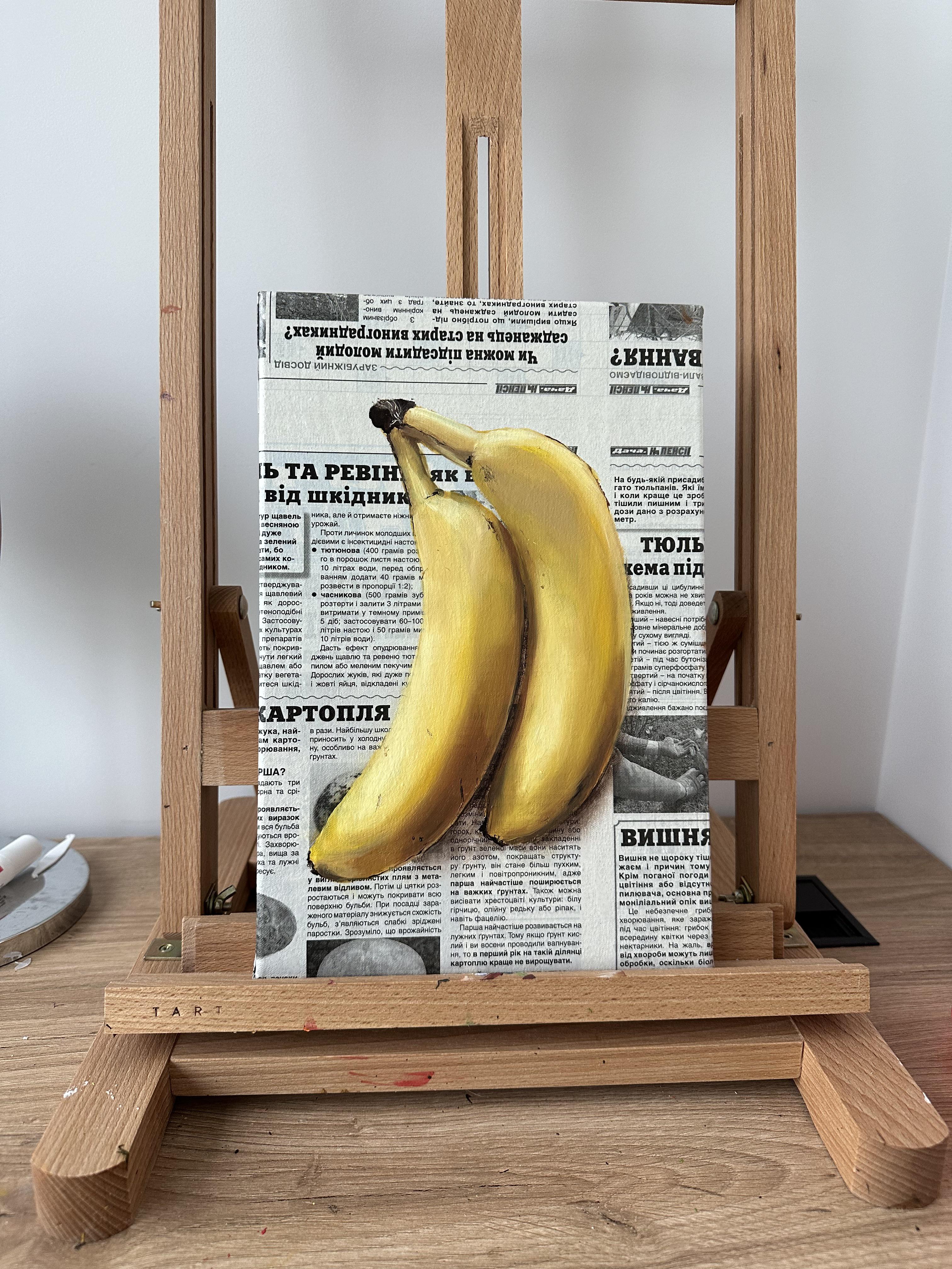 absurdres art_tools_in_frame banana easel food food_focus fruit highres julia_stankevych newspaper no_humans oil_painting_(medium) original painting_(medium) photo_(medium) realistic signature still_life table traditional_media wall_of_text wooden_table
