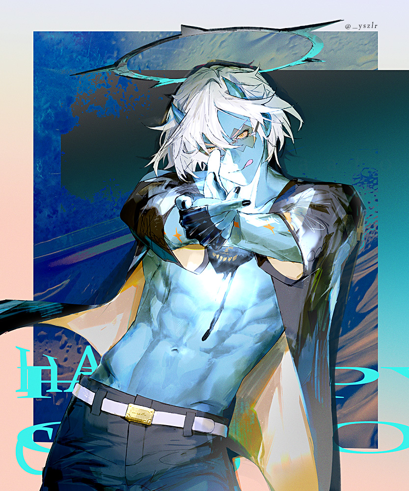 1boy :d abs arms_up belt belt_buckle black_gloves black_nails black_pants blue_skin buckle character_name collarbone colored_skin commentary cowboy_shot demon_horns glasses gloves groin guilty_gear guilty_gear_strive halo happy_chaos horns long_sleeves male_focus nail_polish navel one_eye_closed open_clothes open_mouth open_shirt orange-tinted_eyewear pants parted_bangs shirt short_hair smile solo spiked_halo tinted_eyewear toned toned_male tongue tongue_out twitter_username two-sided_shirt white_belt white_hair x-shaped_eyewear yszlr