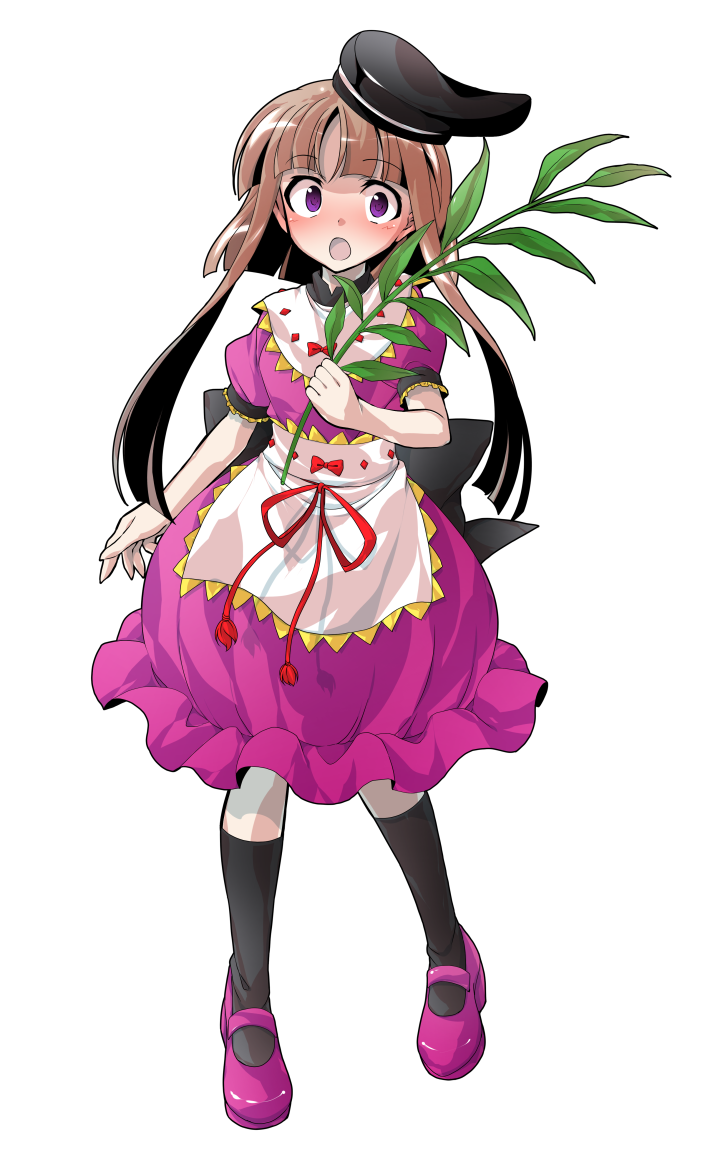 1girl apron black_hat black_socks bow brown_hair commentary_request dairi dress full_body hat large_variant_set myouga_(plant) nishida_satono pink_dress purple_eyes purple_shoes shoes short_hair_with_long_locks short_sleeves smile socks solo standing straight-on tachi-e tate_eboshi touhou transparent_background variant_set waist_apron