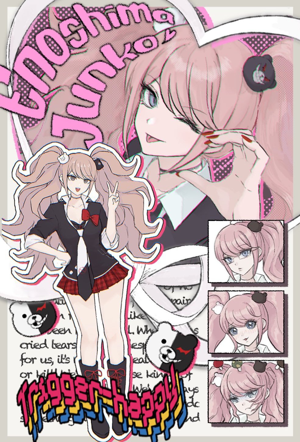 1girl :d :p bear_hair_ornament black_boots black_shirt boots bow danganronpa:_trigger_happy_havoc danganronpa_(series) english_text enoshima_junko full_body hair_ornament hand_up highres miniskirt monokuma multiple_views nail_polish open_mouth plaid_clothes plaid_skirt red_bow red_nails red_skirt shirt skirt smile tongue tongue_out twintails ujuui_msmz v