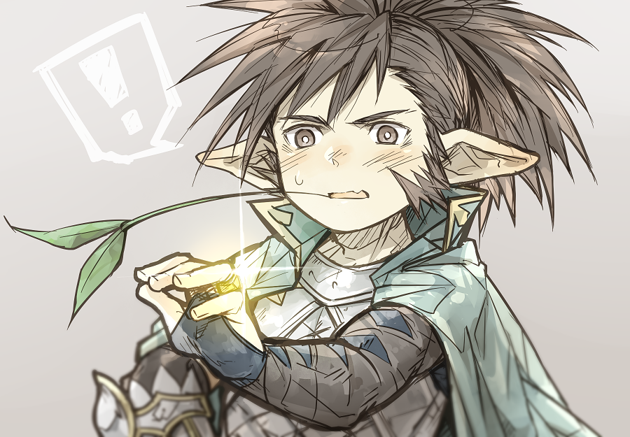 ! 1boy blush brown_hair commentary_request granblue_fantasy grey_background jewelry looking_at_hand male_focus mouth_hold ponytail ring sevilbarra sideburns speech_bubble spoken_exclamation_mark stalk_in_mouth sweatdrop upper_body utakatauta_(takopa)