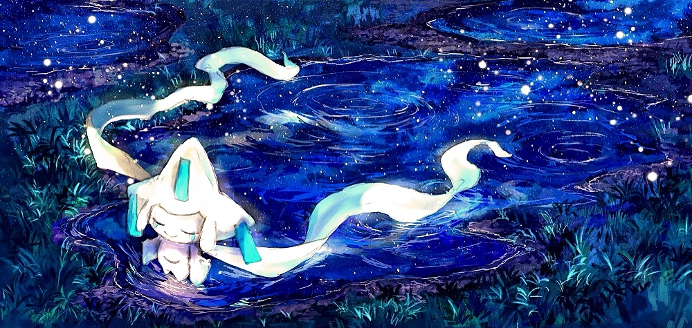closed_eyes closed_mouth commentary_request gen_3_pokemon grass jirachi legendary_pokemon light_particles mythical_pokemon night nintendo pippi_(pixiv_1922055) pokemon pokemon_(creature) pokemon_focus puddle reflection reflective_liquid ripples sky smile solo standing