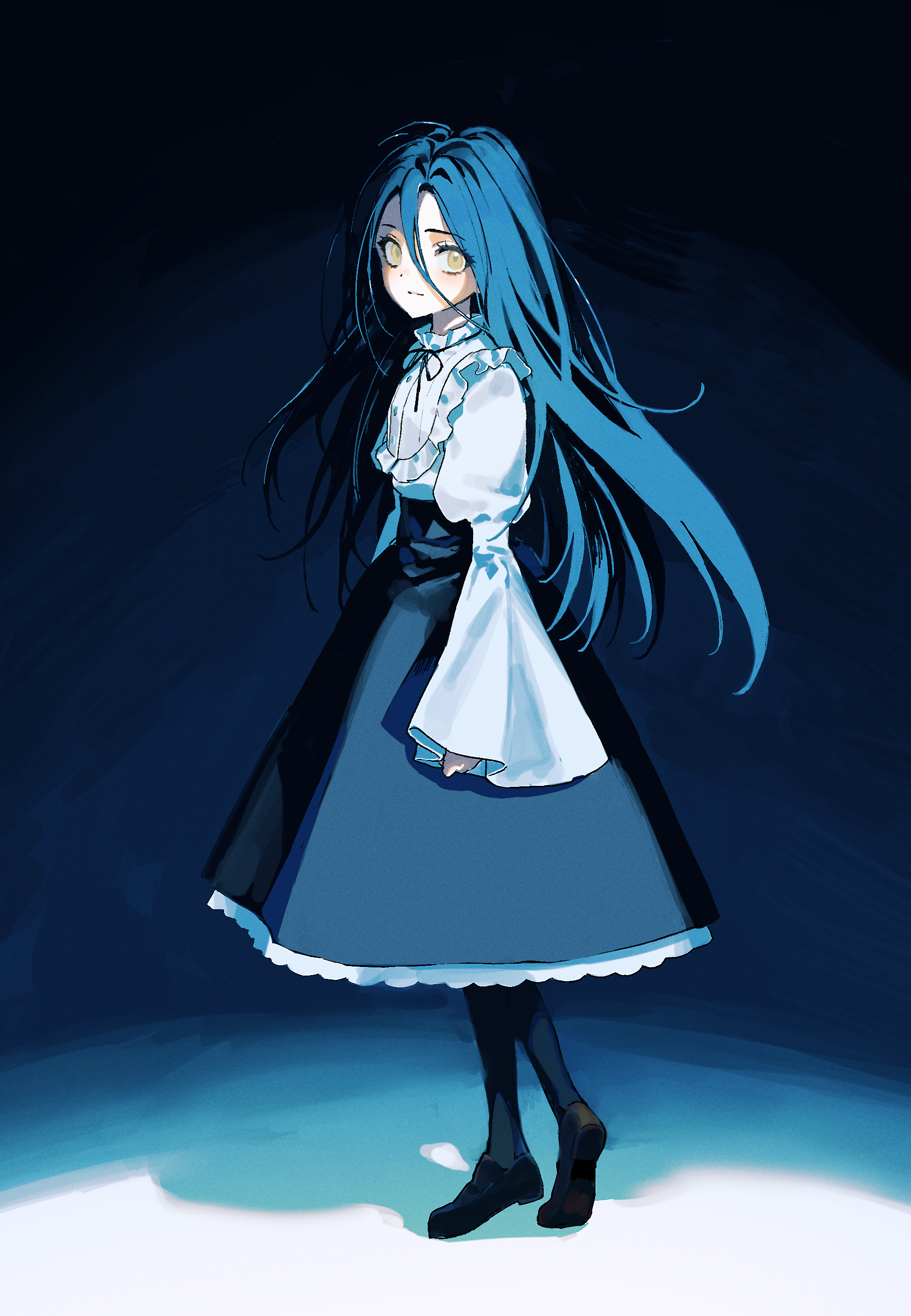 1girl absurdres blue_background blue_hair blue_skirt closed_mouth full_body hair_between_eyes highres kamisaki_hikaru long_hair long_skirt long_sleeves looking_at_viewer medalist_(manga) shirt siotanikun skirt sleeves_past_wrists solo standing straight_hair very_long_hair white_shirt yellow_eyes