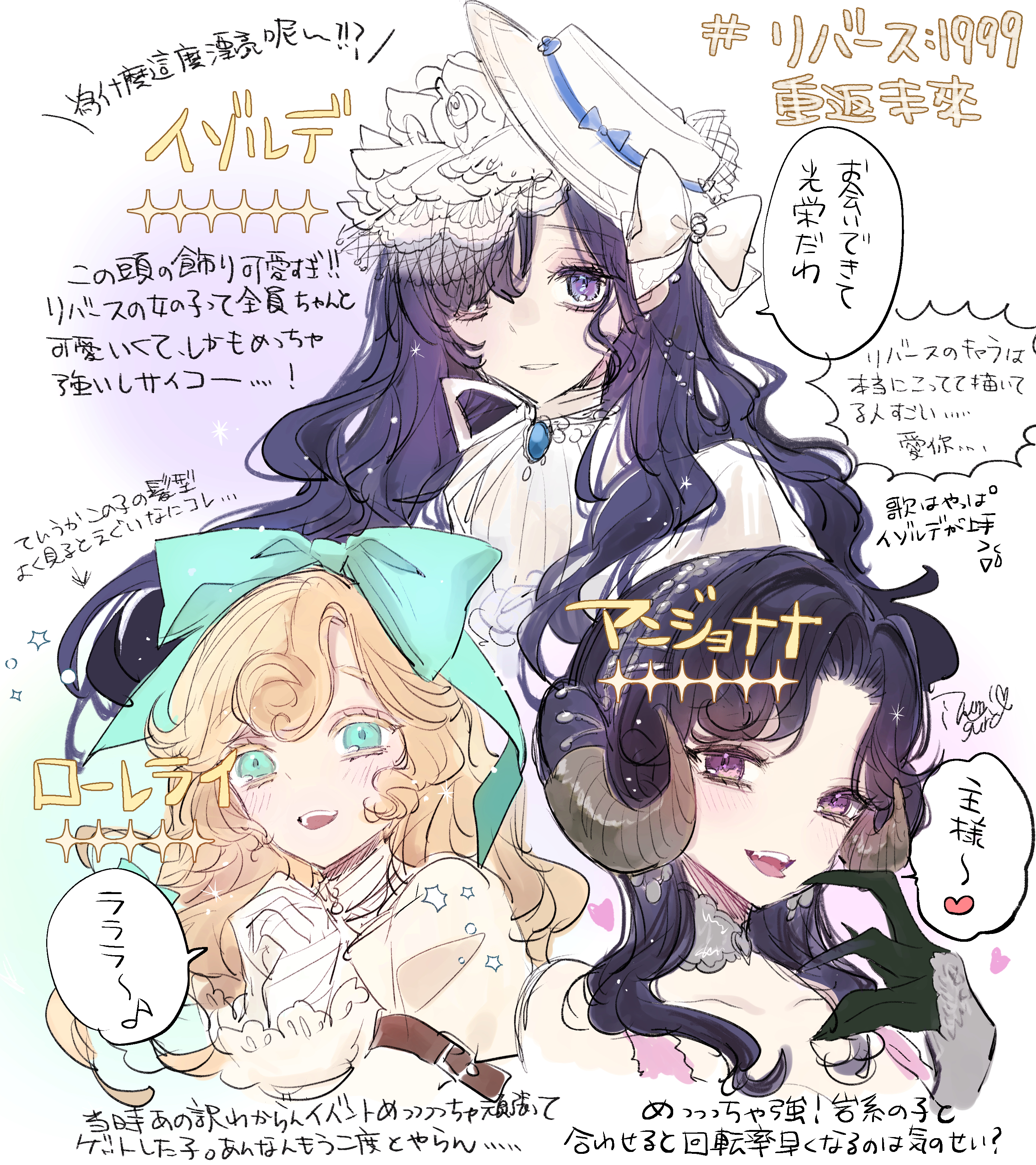 3girls :d absurdres anjo_nala aqua_bow aqua_eyes bandaged_hand bandages bare_shoulders black_hair blonde_hair bow character_name chinese_text curled_horns gloves grey_gloves grey_horns grin gura_(im_gura0205) hair_bow hand_up hat hat_bow highres horns isolde_(reverse:1999) looking_at_viewer lorelei_(reverse:1999) low_horns multiple_girls open_mouth own_hands_together portrait purple_eyes reverse:1999 smile speech_bubble tongue tongue_out translation_request veil white_hat white_veil