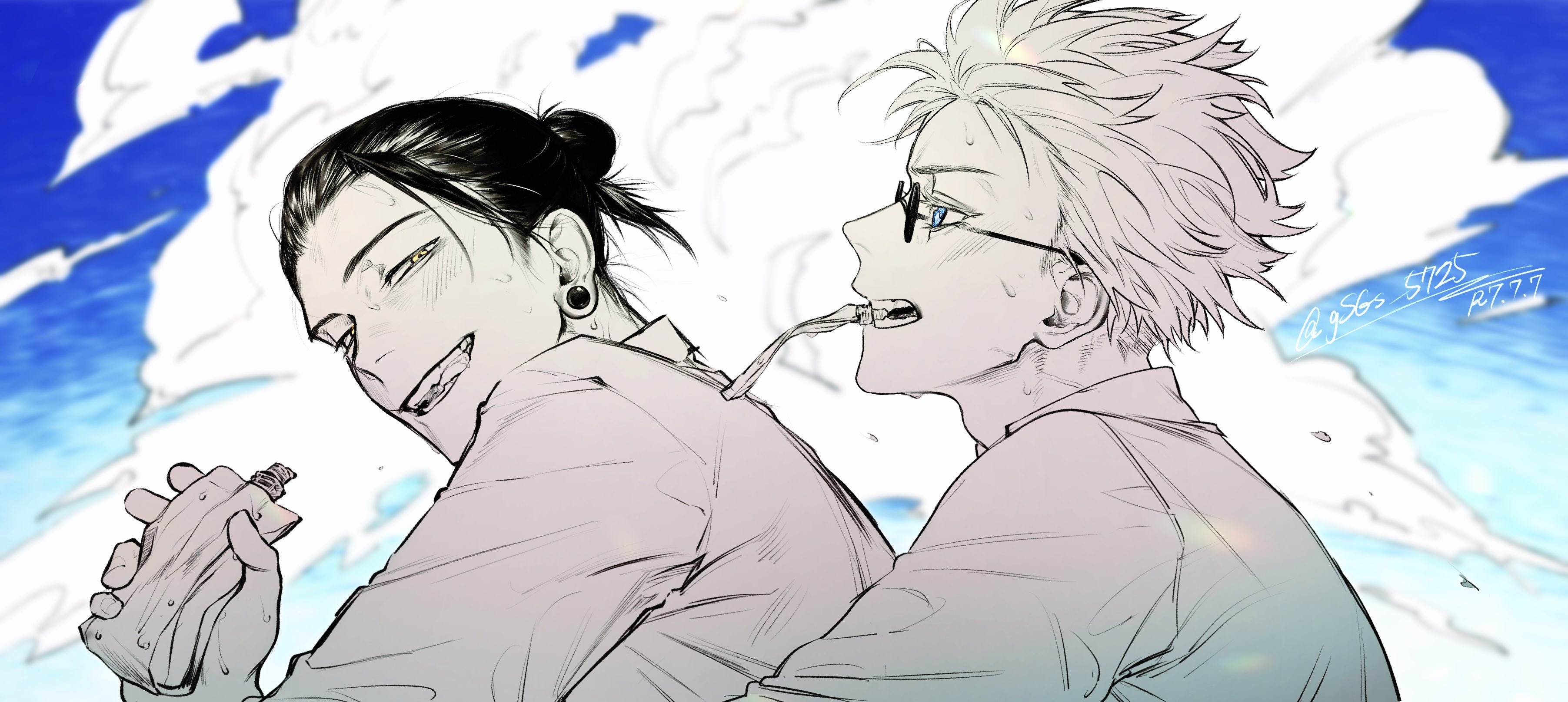 2boys absurdres aged_down blue_eyes blue_sky cloud cloudy_sky collared_shirt dated from_side geto_suguru gojo_satoru gsgs_5725 hair_bun hair_pulled_back highres holding jujutsu_kaisen looking_at_viewer male_focus monochrome monochrome_background mouth_hold multiple_boys plug_(piercing) round_eyewear saliva shirt short_hair sky smile spot_color teeth teeth_hold tongue tongue_out twitter_username upper_body white_shirt yellow_eyes