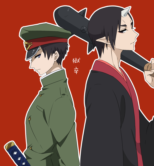 2boys anime_coloring back-to-back black_eyes black_hair black_kimono breast_pocket closed_mouth club club_(weapon) coat collared_coat crossover demon_horns expressionless forehead furrowed_brow gokuto_jihen green_coat green_hat grey_eyes hat height_difference high_collar holding holding_club holding_weapon hoozuki_(hoozuki_no_reitetsu) hoozuki_no_reitetsu horns japanese_clothes katana kimono kirishima_(gokuto_jihen) kurimilove light_frown long_sleeves male_focus military_hat military_uniform multiple_boys outline over_shoulder peaked_cap pocket pointy_ears pointy_nose red_background sheath sheathed short_hair simple_background single_horn spiked_club sword thick_eyebrows translation_request undershirt upper_body weapon weapon_over_shoulder white_horns white_outline
