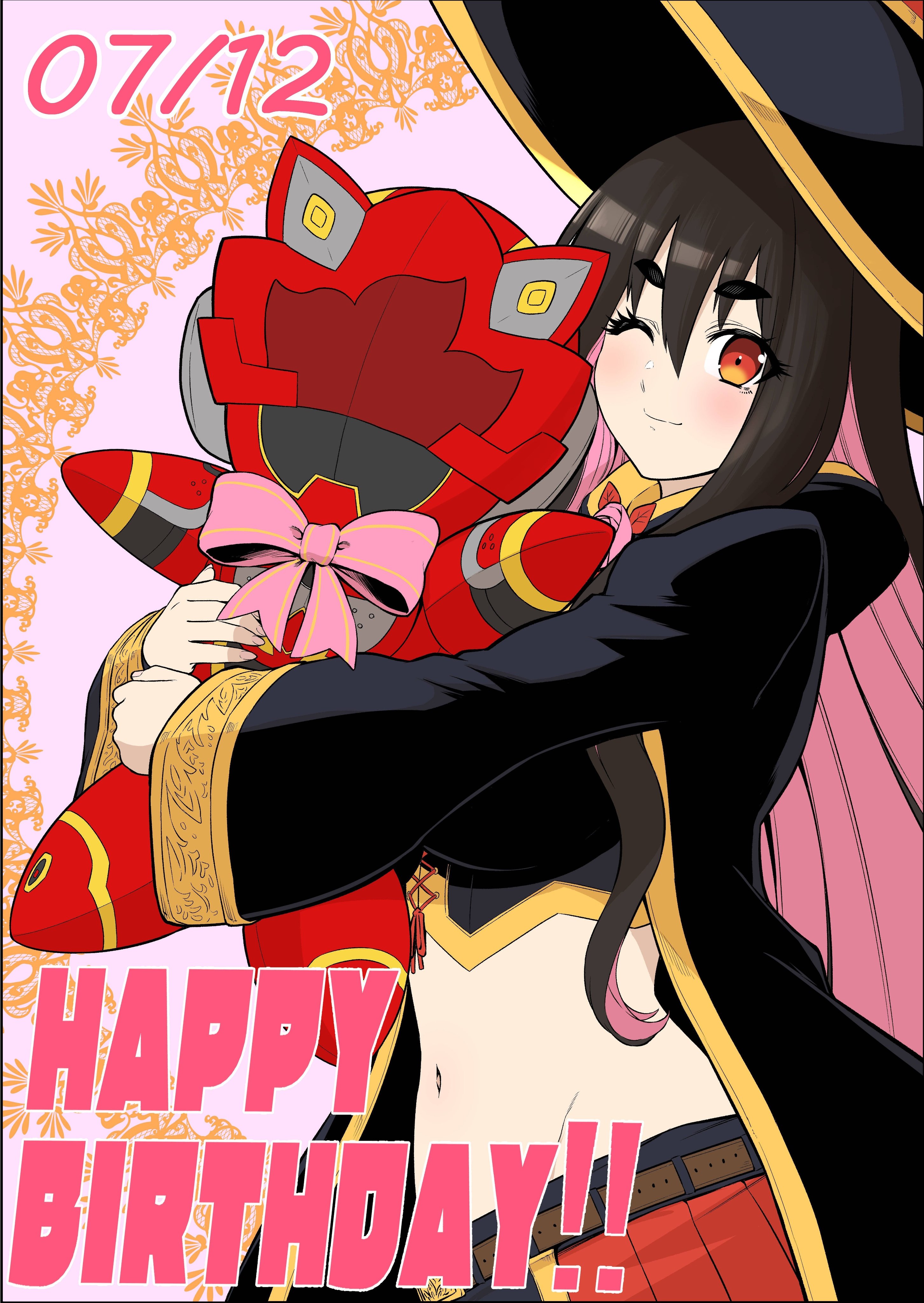 1boy 1girl absurdres asagaki_togo black_hair breasts colored_inner_hair happy_birthday hat highres large_breasts long_hair looking_at_viewer midriff multicolored_hair nakayoshi_koyoshi navel one_eye_closed pink_hair red_eyes sentai_red_isekai_de_boukensha_ni_naru skirt stuffed_toy witch_hat yihdra_arvoln