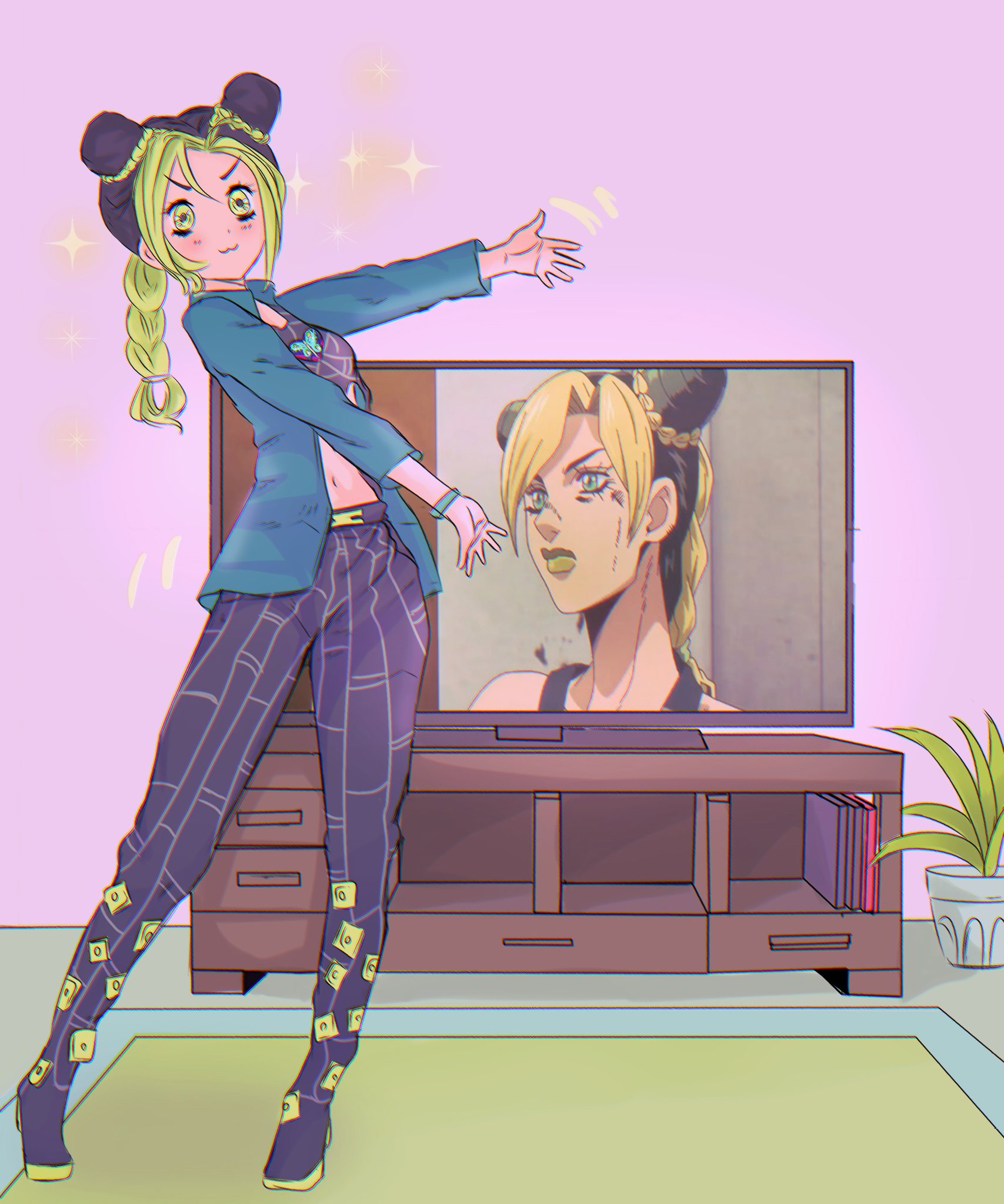 1girl :3 black_hair black_pants black_shirt black_shoes blue_shirt blush bracelet braid braided_ponytail breasts bun_with_braided_base carpet commentary double_bun english_commentary full_body green_eyes green_hair green_lips hair_bun henoopd highres indoors jewelry jojo_no_kimyou_na_bouken kuujou_jolyne long_hair long_sleeves looking_at_viewer looking_to_the_side midriff multicolored_hair navel pants plant portrait screenshot_inset shirt shoes small_breasts solo sparkle_background stone_ocean television two-tone_hair