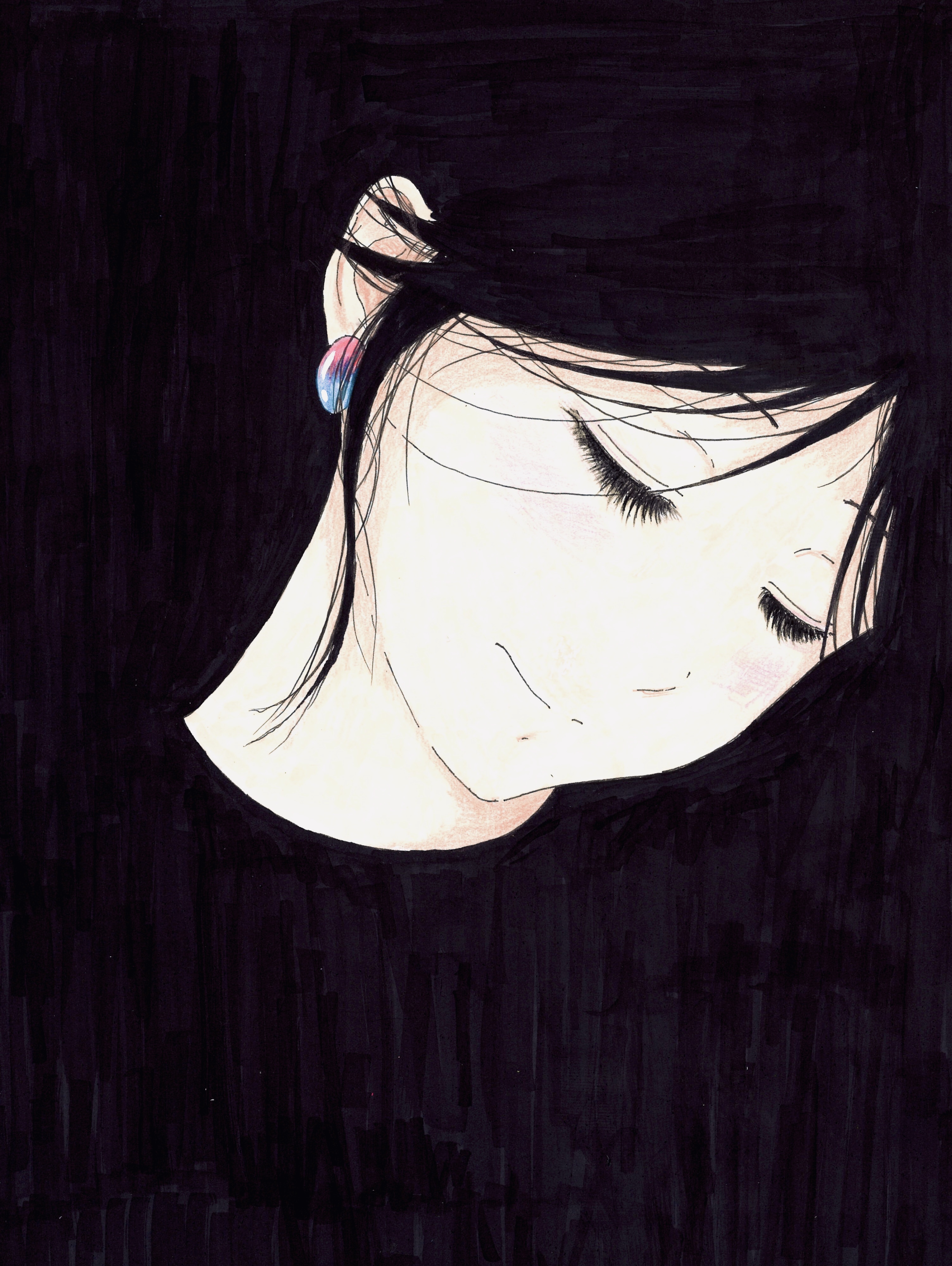1girl absurdres bbmasa black_background black_hair black_theme closed_eyes closed_mouth commentary earrings hibike!_euphonium highres jewelry kasaki_nozomi liz_to_aoi_tori portrait solo traditional_media