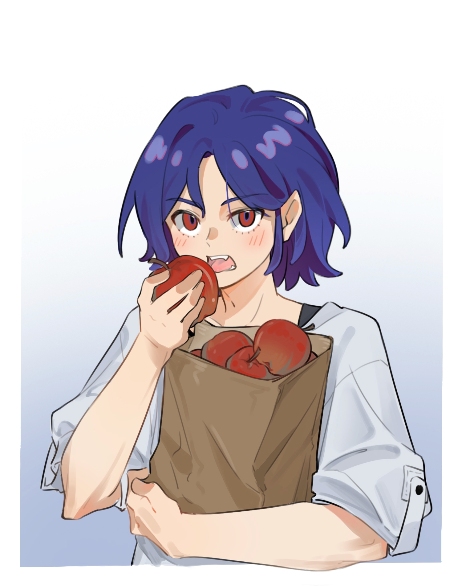 1boy apple blue_hair blush eating fang food fruit gradient_background grey_background gundam gundam_gquuuuuux highres holding holding_food holding_fruit looking_at_viewer male_focus open_mouth red_eyes shirt short_hair shuji_ito solo upper_body white_background white_shirt yanjiayi15642