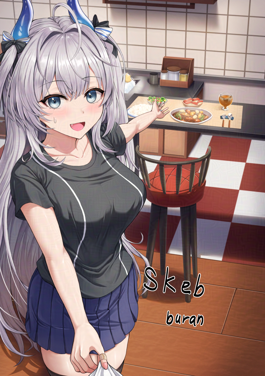 :d aqua_eyes artist_name azur_lane bandaid bandaid_on_finger bandaid_on_hand black_shirt blue_eyes blue_horns blue_skirt blush buran_(22x) commission food grey_hair hair_ribbon highres horns looking_at_viewer manjuu_(azur_lane) open_mouth pleated_skirt pov ribbon rice salad shirt short_sleeves skeb_commission skirt smile suffren_(azur_lane) sweatdrop white_ribbon