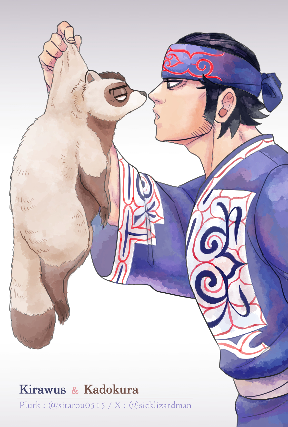 2boys ainu ainu_clothes animal animalization black_eyes black_hair eye_contact facial_hair golden_kamuy gradient_background headband highres holding holding_animal kadokura_(golden_kamuy) kirawus_(golden_kamuy) lizard_taro looking_at_another male_focus multiple_boys plurk_username profile sideburns sideburns_stubble simple_background standing stubble twitter_username