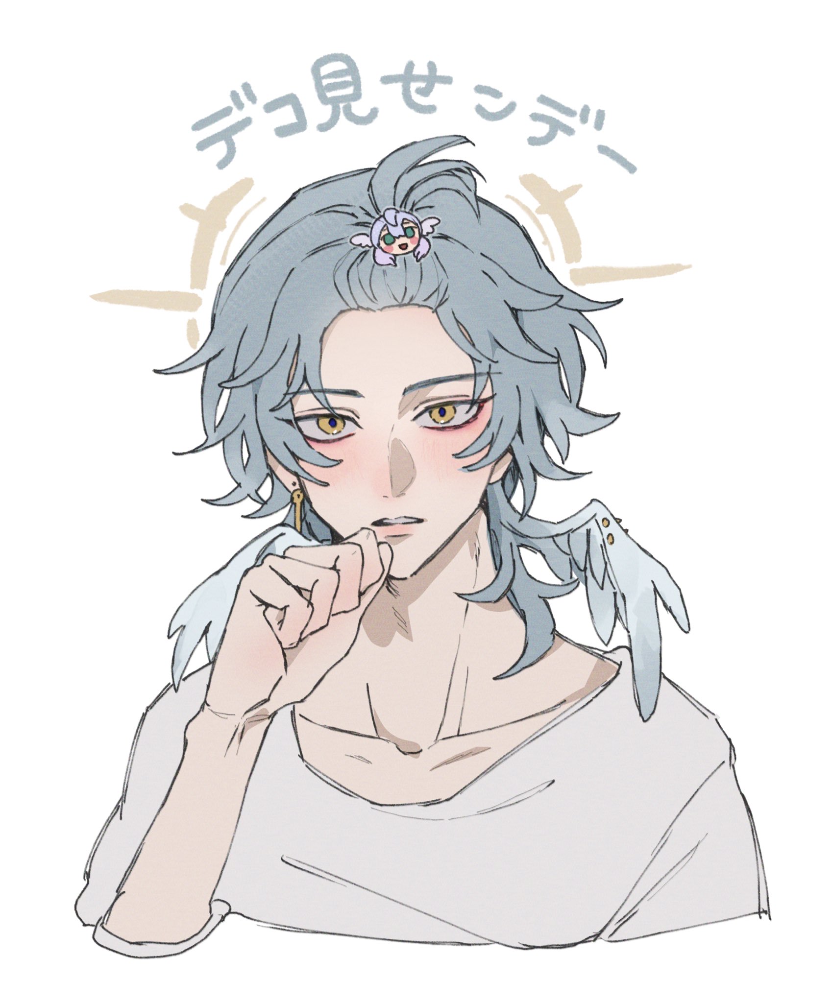 1boy bangs_pinned_back collarbone commentary_request crew_neck cropped_torso earrings feathered_wings grey_hair hair_ornament hairclip halo halo_behind_head head_wings highres honkai:_star_rail honkai_(series) jewelry looking_at_viewer male_focus medium_hair parted_lips sanpaku shirt simple_background single_earring solo sunday_(honkai:_star_rail) teeth translation_request white_background white_shirt wings xo_5ss yellow_eyes
