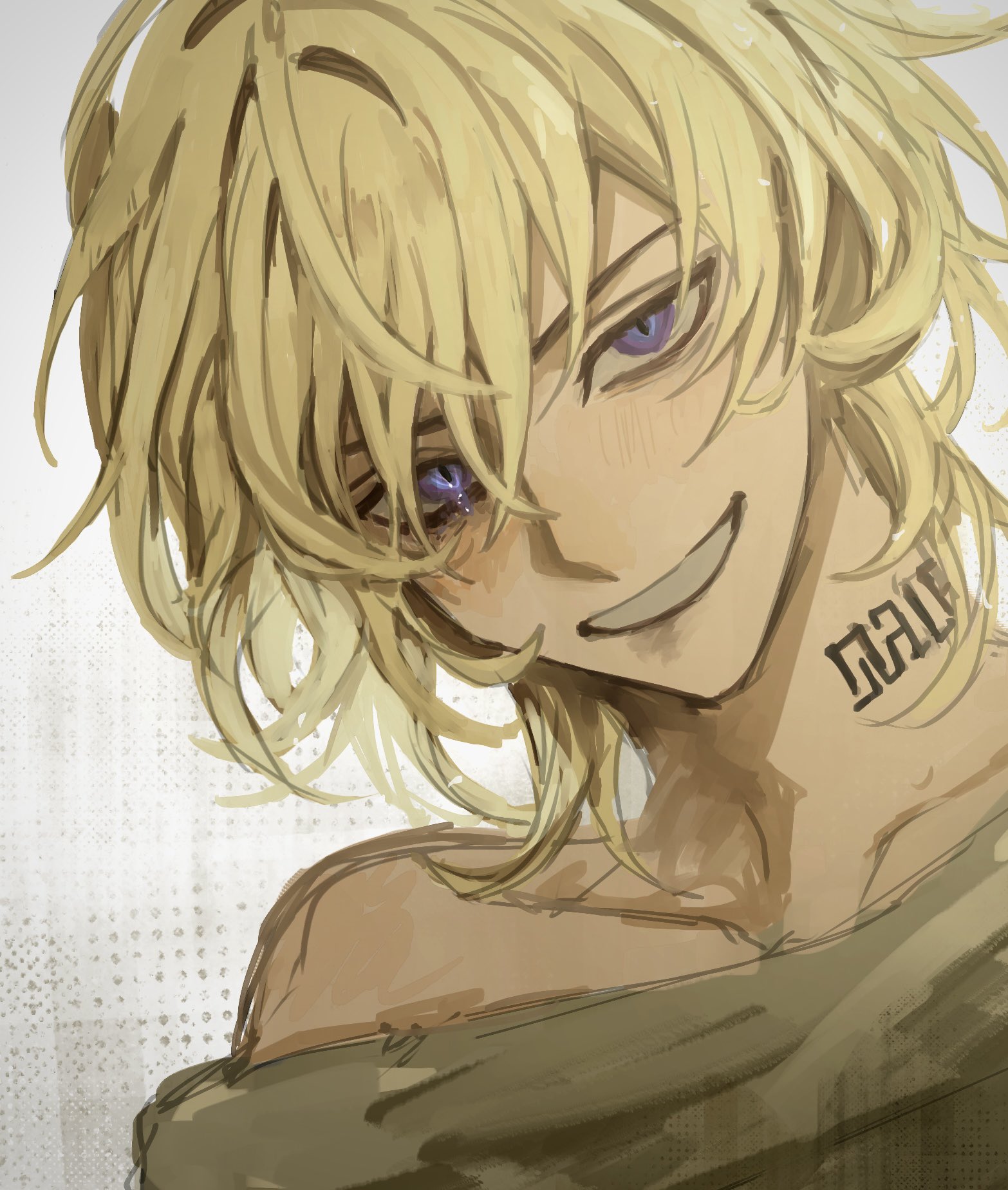 1boy aventurine_(honkai:_star_rail) ben-day_dots blonde_hair collarbone grin highres honkai:_star_rail honkai_(series) looking_at_viewer male_focus medium_hair multicolored_eyes neck_tattoo portrait screentones slit_pupils smile solo tattoo teeth xo_5ss
