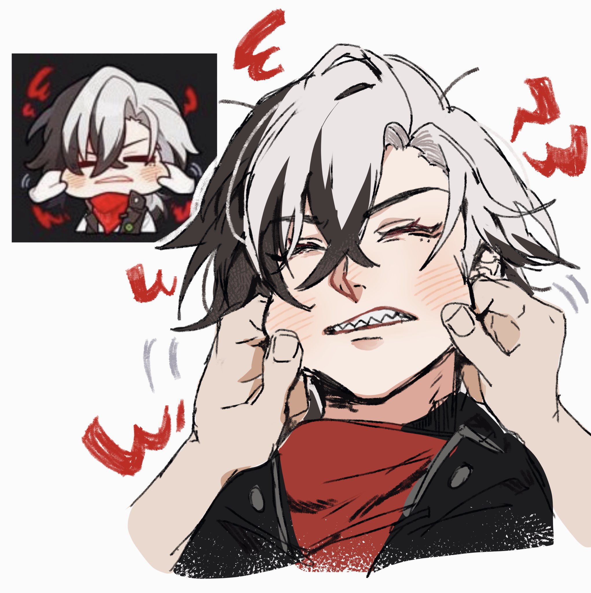 1boy 1other annoyed black_hair black_jacket blush boothill_(honkai:_star_rail) cheek_pinching clenched_teeth closed_eyes commentary_request cropped_torso crossed_bangs eyelashes fingernails highres honkai:_star_rail honkai_(series) jacket jaggy_lines male_focus motion_lines multicolored_hair pinching red_scarf reference_inset scarf sharp_teeth solo solo_focus teeth white_background white_hair xo_5ss