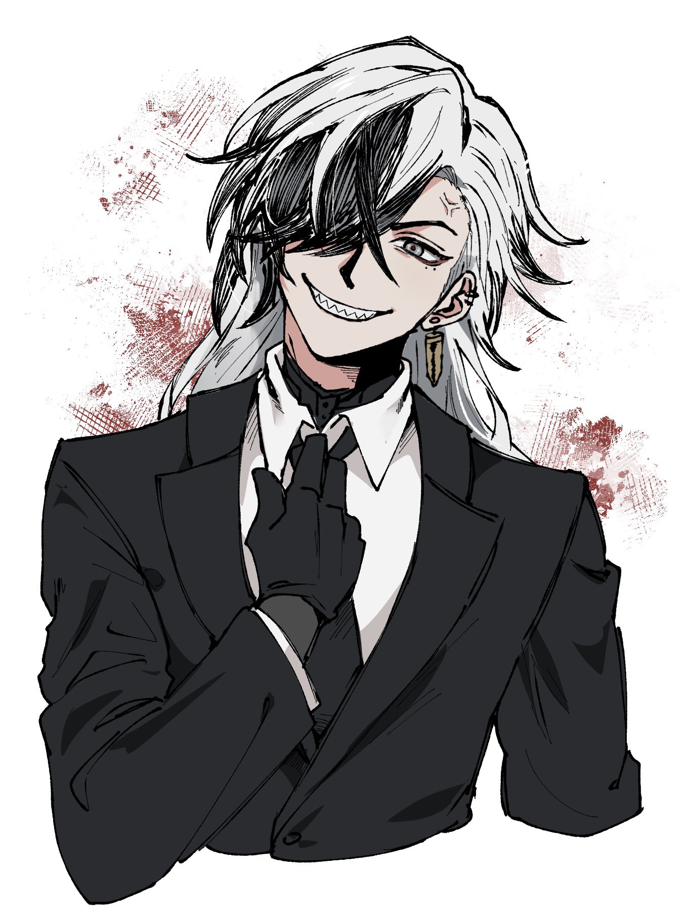 1boy adjusting_clothes adjusting_necktie alternate_costume anger_vein arm_up black_gloves black_hair black_jacket black_necktie boothill_(honkai:_star_rail) collared_shirt cropped_arm cropped_torso crossed_bangs ear_piercing earrings formal_clothes gloves grey_eyes grin hair_over_one_eye head_tilt highres honkai:_star_rail honkai_(series) jacket jewelry lapels layered_sleeves long_hair long_sleeves looking_to_the_side male_focus multicolored_hair necktie one_eye_covered parted_bangs piercing sharp_teeth shirt sideways_glance smile solo suit_jacket teeth white_background white_hair white_shirt wing_collar xo_5ss