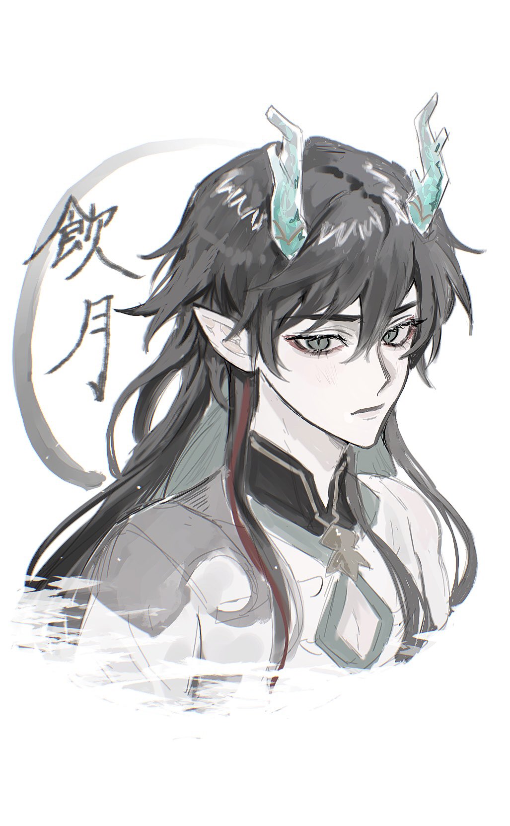 1boy black_hair closed_mouth clothing_cutout collared_shirt commentary_request cropped_torso dan_heng_(honkai:_star_rail) dan_heng_(imbibitor_lunae)_(honkai:_star_rail) dragon_boy dragon_horns eyelashes eyeliner grey_eyes hair_between_eyes hair_intakes highres honkai:_star_rail honkai_(series) horns long_hair looking_to_the_side makeup male_focus official_alternate_costume pointy_ears shirt solo translation_request white_background xo_5ss