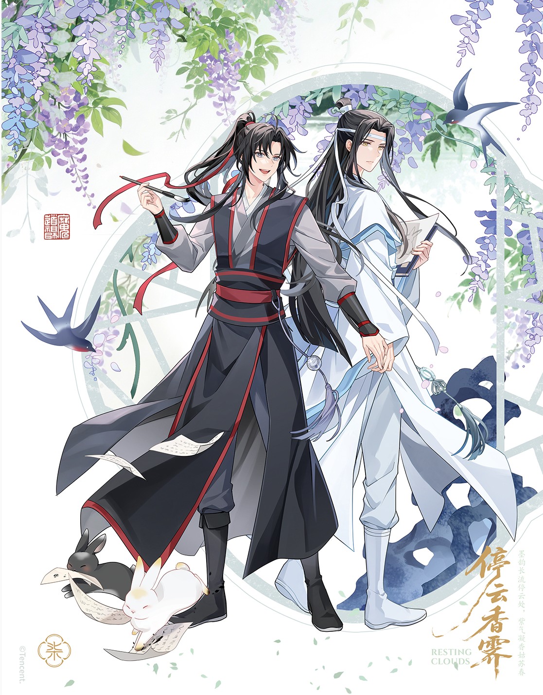 2boys ahoge bird black_boots black_hair black_hanfu black_pants black_rabbit_(animal) book boots calligraphy_brush chinese_clothes chinese_text closed_mouth commentary door english_commentary falling_leaves falling_petals flower full_body grey_eyes hair_ribbon hanfu headband high_ponytail highres holding holding_book holding_calligraphy_brush holding_hands holding_paintbrush holding_paper lan_wangji leaf long_hair long_sleeves looking_at_viewer looking_back male_focus modao_zushi multiple_boys official_art open_mouth paintbrush pants paper petals ponytail purple_flower rabbit red_ribbon red_sash ribbon robe rock sash seal_impression sidelocks sleeves_past_wrists smile standing swallow_(bird) tassel third-party_source topknot tunic usagishi very_long_hair wei_wuxian wei_wuxian_(yunmeng_clan) white_boots white_hanfu white_headband white_pants white_rabbit_(animal) wide_sleeves wisteria xiao_guan_(headdress) yaoi yaopei yellow_eyes