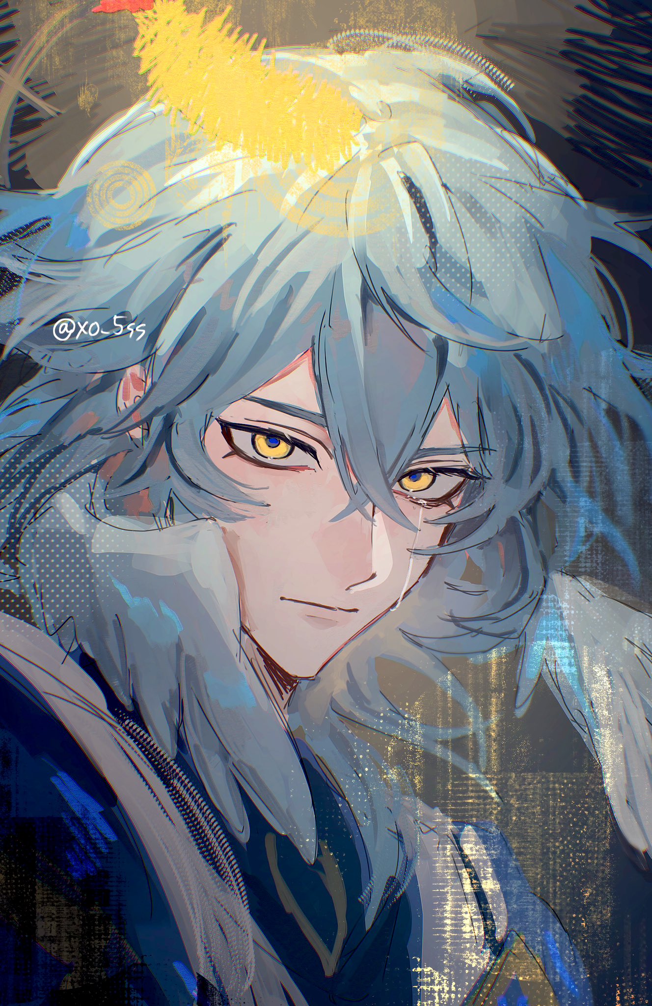 1boy blue_hair closed_mouth commentary_request double-parted_bangs feathered_wings feathers hair_between_eyes head_wings highres honkai:_star_rail honkai_(series) looking_at_viewer lower_eyelashes_only male_focus portrait sanpaku solo sunday_(honkai:_star_rail) twitter_username upper_body wings xo_5ss yellow_eyes