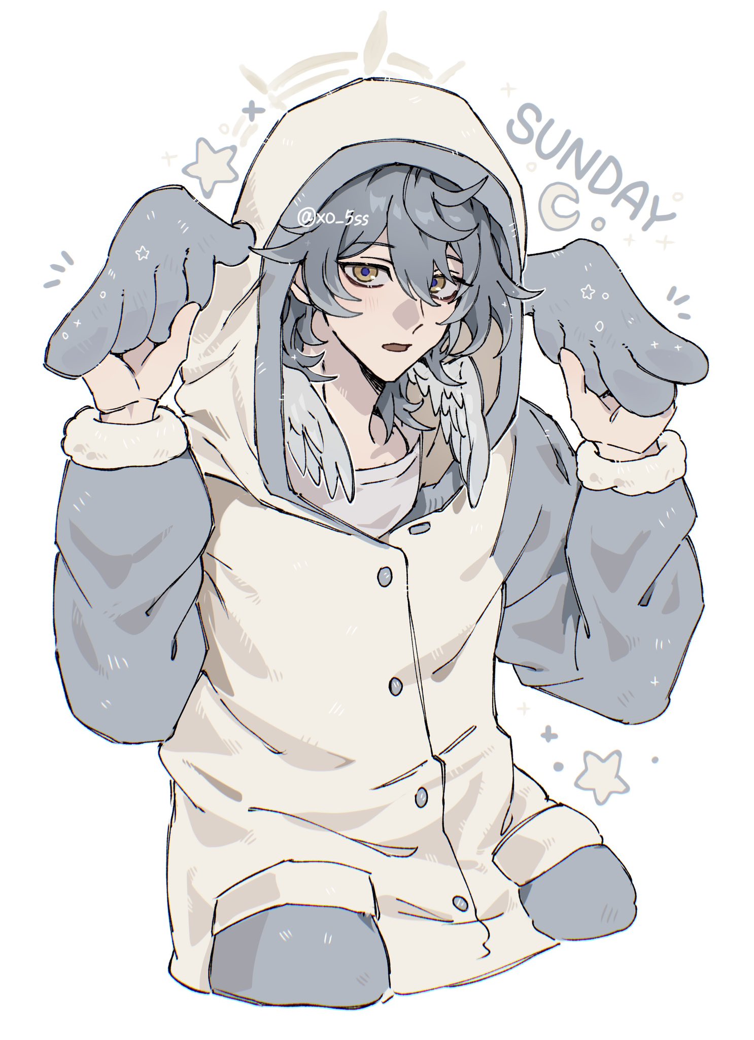 1boy alternate_costume arms_up character_name commentary_request crescent crew_neck cropped_legs double-parted_bangs feathered_wings fur-trimmed_sleeves fur_trim grey_hair hair_between_eyes halo halo_behind_head head_wings highres honkai:_star_rail honkai_(series) hood hood_up hooded_pajamas long_sleeves looking_at_viewer male_focus open_mouth orange_eyes pajamas shirt solo star_(symbol) sunday_(honkai:_star_rail) twitter_username white_background white_shirt white_wings wings xo_5ss