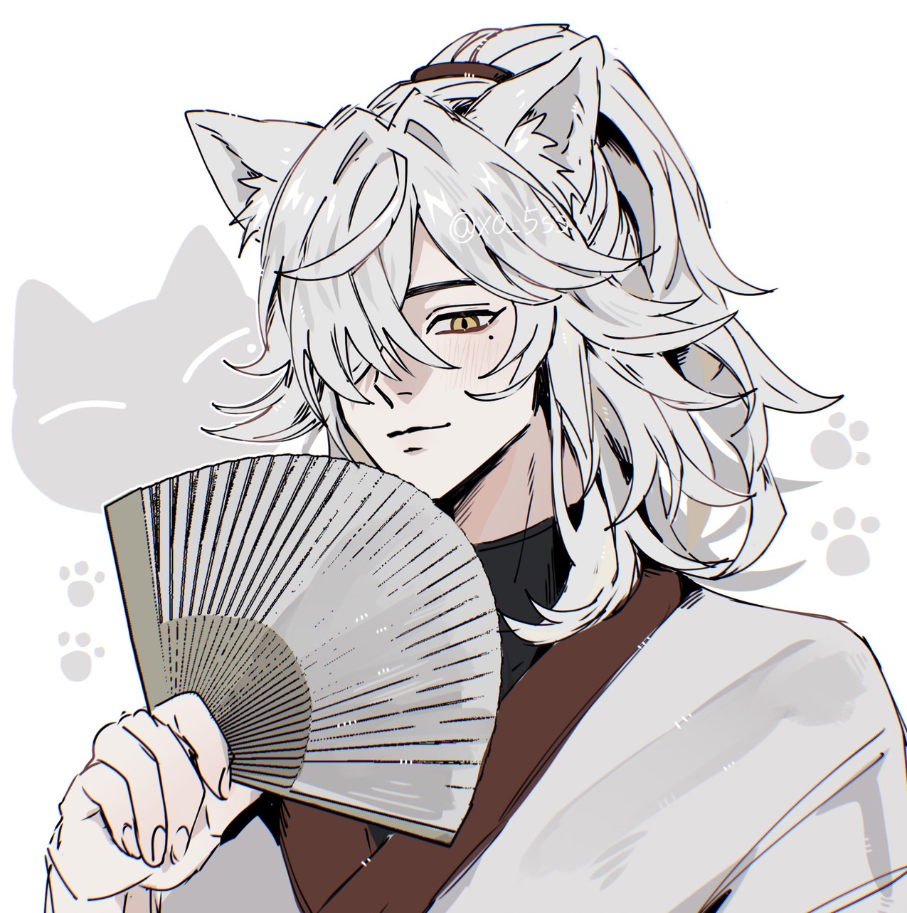 1boy alternate_costume animal_ear_fluff animal_ears arm_up black_shirt closed_mouth commentary_request crossed_bangs fingernails hair_over_one_eye hand_fan highres holding holding_fan honkai:_star_rail honkai_(series) japanese_clothes jing_yuan kemonomimi_mode kimono light_smile male_focus mole mole_under_eye one_eye_covered parted_bangs paw_print ponytail shirt twitter_username upper_body wavy_hair white_hair white_kimono xo_5ss yellow_eyes yukata