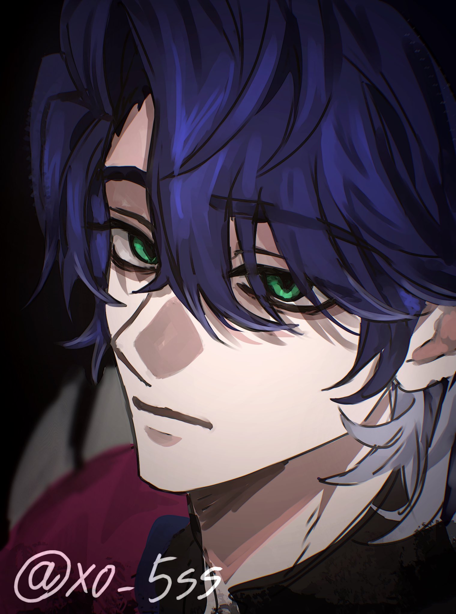 1boy :| black_background blue_hair closed_mouth commentary_request curtained_hair expressionless green_eyes hair_behind_ear hair_between_eyes highres honkai:_star_rail honkai_(series) male_focus parted_hair portrait sampo_koski short_hair simple_background solo twitter_username xo_5ss