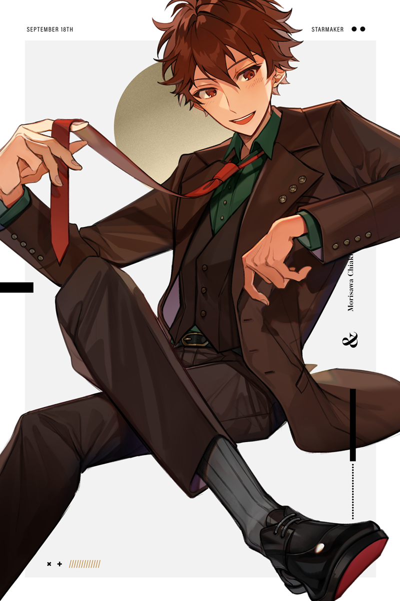 1boy belt belt_buckle black_belt black_shoes black_vest brown_hair brown_jacket brown_pants buckle buttons character_name collared_shirt crossed_legs dongbackbyul dress_shirt ensemble_stars! figure_four_sitting green_shirt grey_socks hair_between_eyes hand_up highres holding_necktie jacket lapels light_blush long_sleeves loose_necktie male_focus morisawa_chiaki necktie open_clothes open_jacket open_mouth pants red_eyes red_necktie shirt shirt_tucked_in shoes short_hair sitting smile socks solo teeth upper_teeth_only vest waistcoat