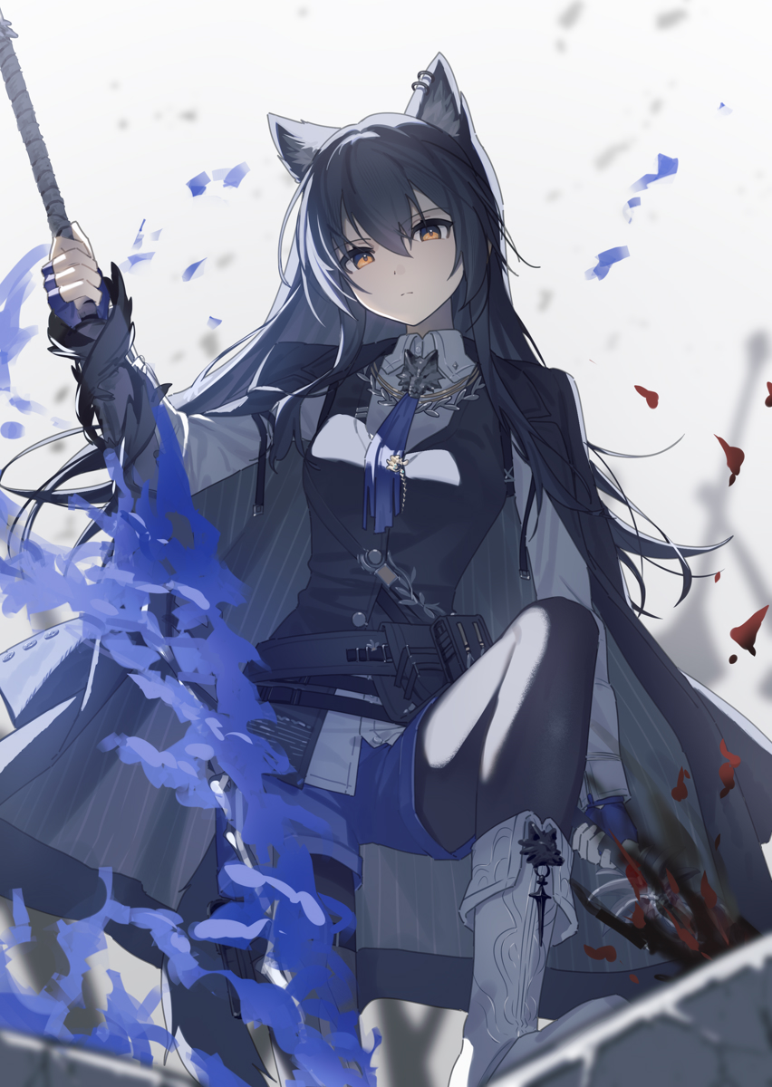 1girl animal_ear_fluff animal_ears arknights black_hair black_pantyhose black_vest bolo_tie boots closed_mouth commentary_request dual_wielding fingerless_gloves gloves grey_boots hair_between_eyes highres holding holding_sword holding_weapon knee_boots long_hair looking_at_viewer nekoln official_alternate_costume pantyhose purple_gloves solo sword texas_(arknights) texas_the_omertosa_(arknights) vest weapon wolf_ears wolf_girl yellow_eyes