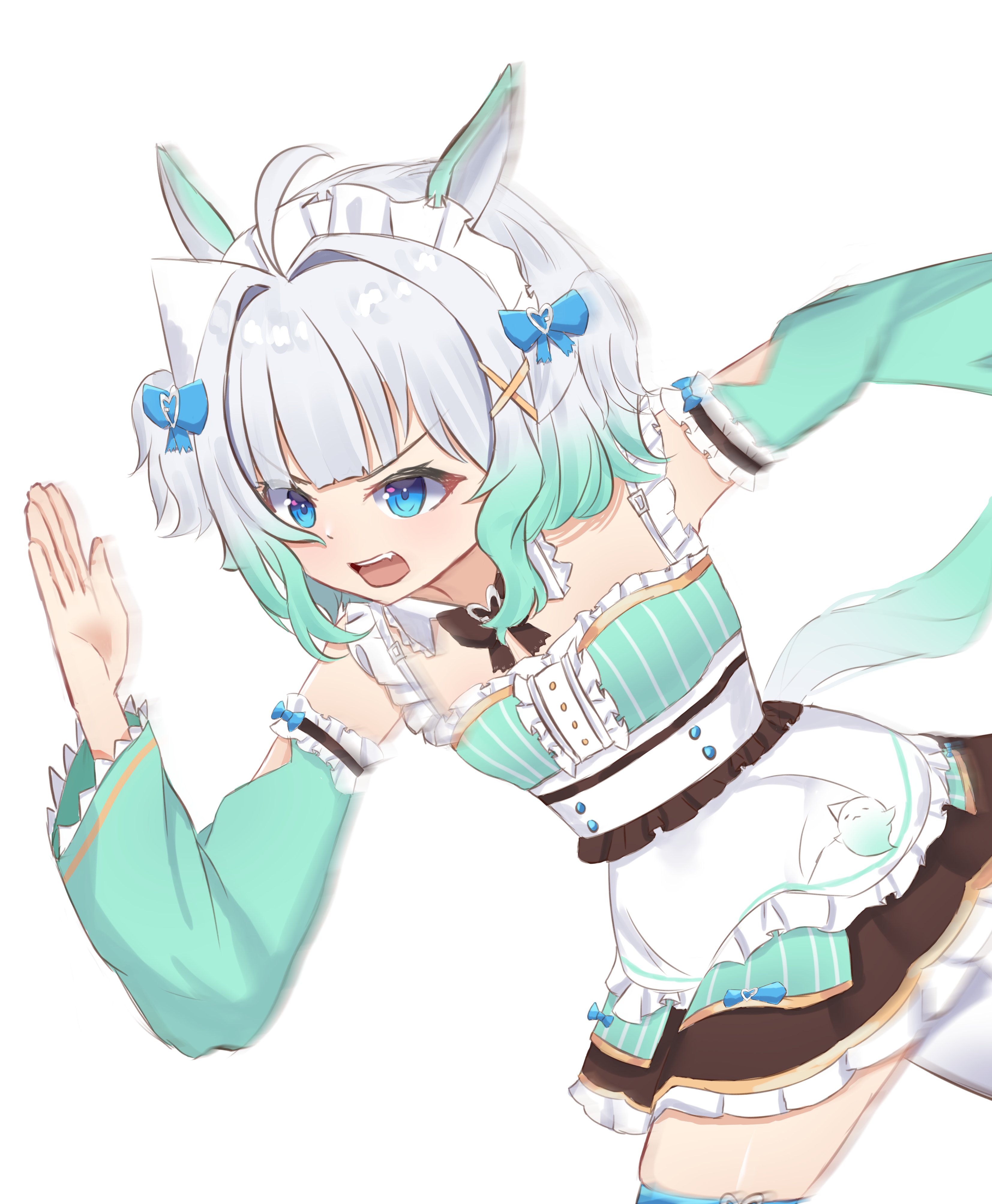 1girl absurdres animal_ears bow dress ear_bow ghost ghost_girl ghost_hair_ornament gradient_hair green_dress green_hair green_sleeves hair_ornament highres horse_ears horse_girl horse_tail indie_virtual_youtuber jaykriver kemonomimi_mode maid maid_headdress mint_fantome motion_lines multicolored_hair open_mouth pants running shirt short_hair skirt sleeves_past_fingers sleeves_past_wrists speed_lines tail umamusume virtual_youtuber white_headdress x_hair_ornament