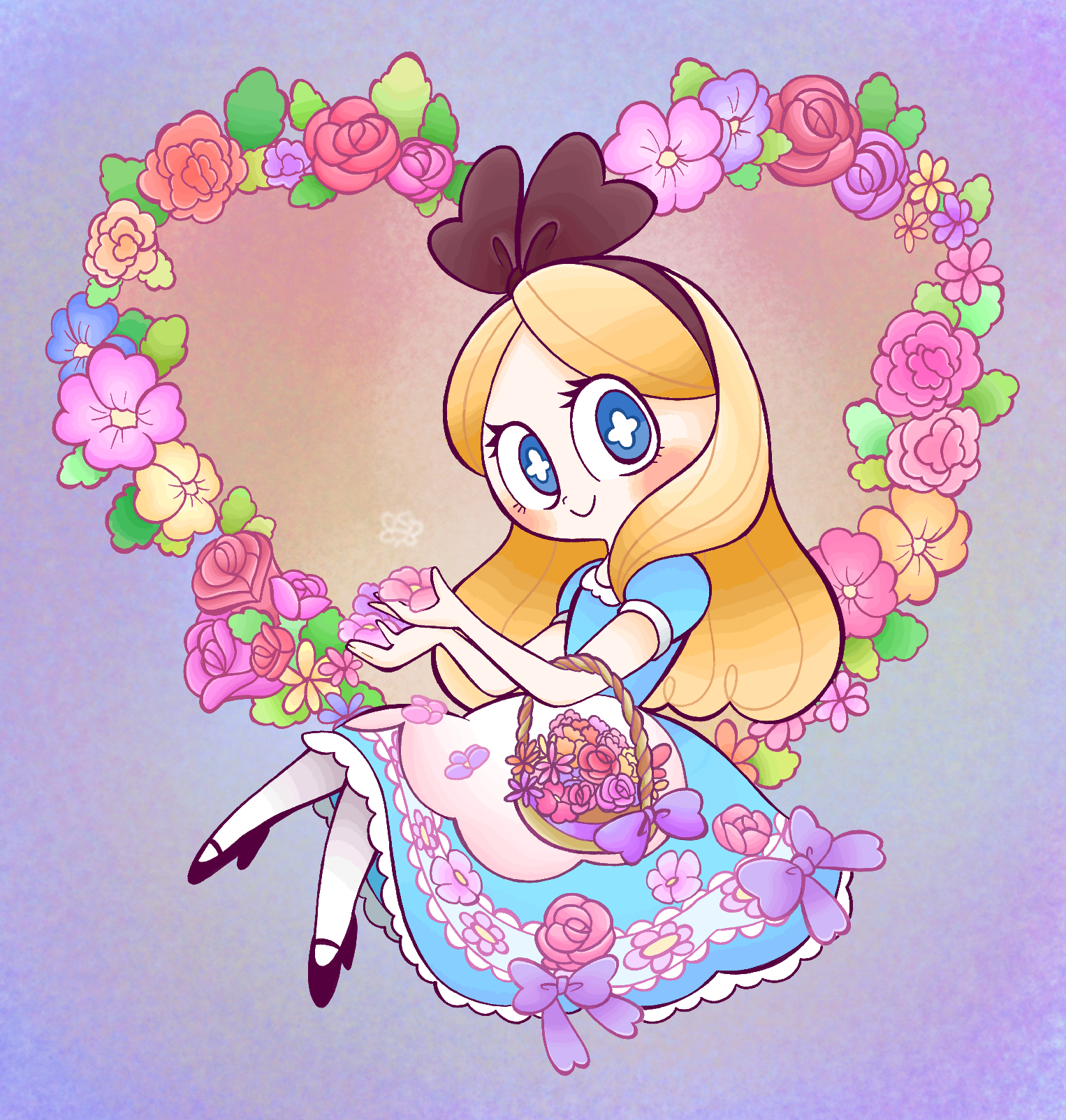 1girl alice's_adventures_in_wonderland alice_(alice_in_wonderland) basket blonde_hair blue_dress blue_eyes blue_flower brown_hairband closed_mouth dress eyelashes flower full_body hairband highres holding holding_flower honeypuff long_hair pink_flower purple_flower short_sleeves smile solo