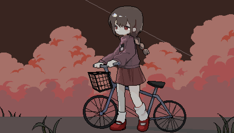 1girl bicycle braid braided_ponytail brown_hair brown_skirt cloud cumulonimbus_cloud full_body hashtag-only_commentary long_hair long_sleeves looking_ahead madotsuki mary_janes outdoors pink_sweater pixel_art red_eyes red_shoes reihoshii shoes skirt socks solo sweater walking white_socks yume_nikki