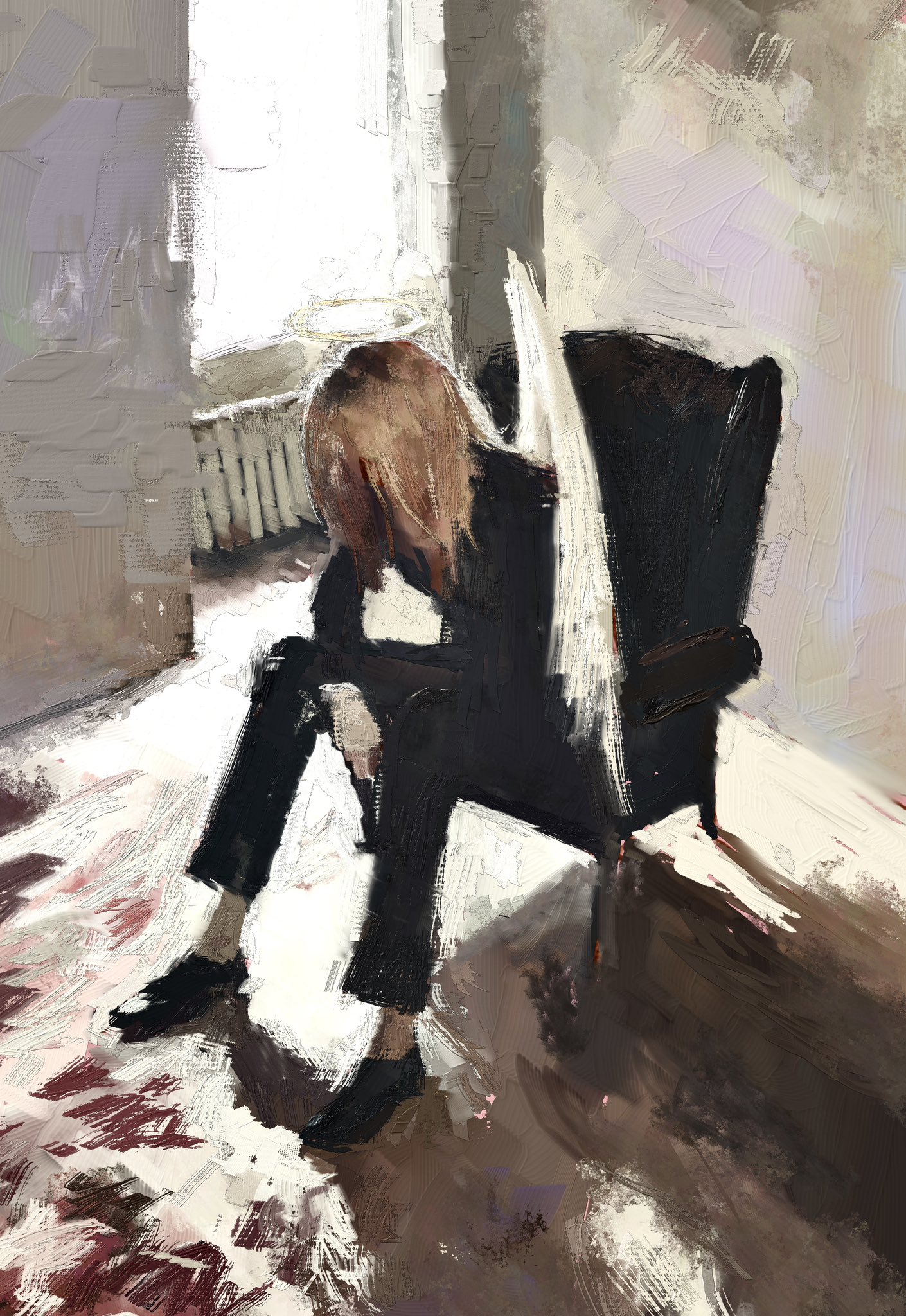 1boy angel angel_devil_(chainsaw_man) angel_wings black_jacket black_pants black_shirt brown_hair chainsaw_man chair feathered_wings floor formal_clothes fuyumurasaki halo highres indoors jacket long_hair male_focus painterly pants shirt sitting solo traditional_halo white_wings window wings