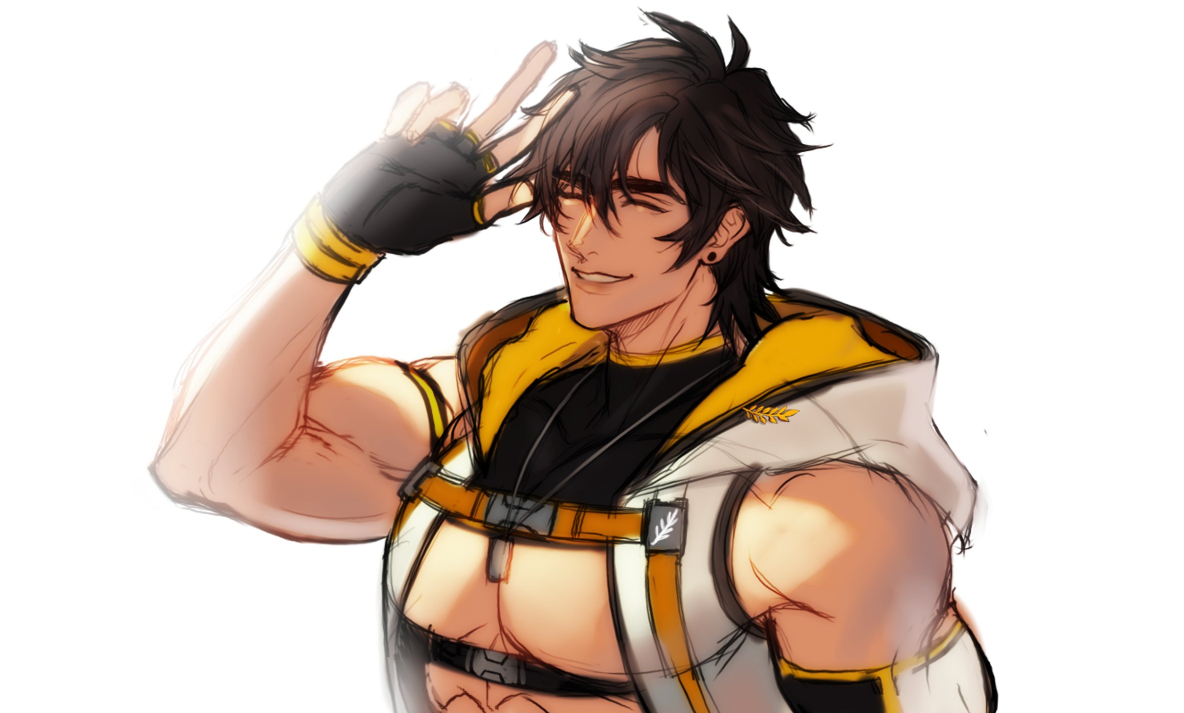 1boy brown_hair closed_eyes crop_top ear_piercing fingerless_gloves gloves highres indie_virtual_youtuber jouvru kite_hasegawa male_focus muscular open_clothes piercing smile v