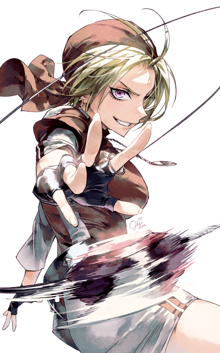 1girl bandana black_gloves blonde_hair brown_bandana commentary earrings fingerless_gloves gloves highres jewelry malin_(kof) nishita short_hair shorts signature solo the_king_of_fighters yo-yo